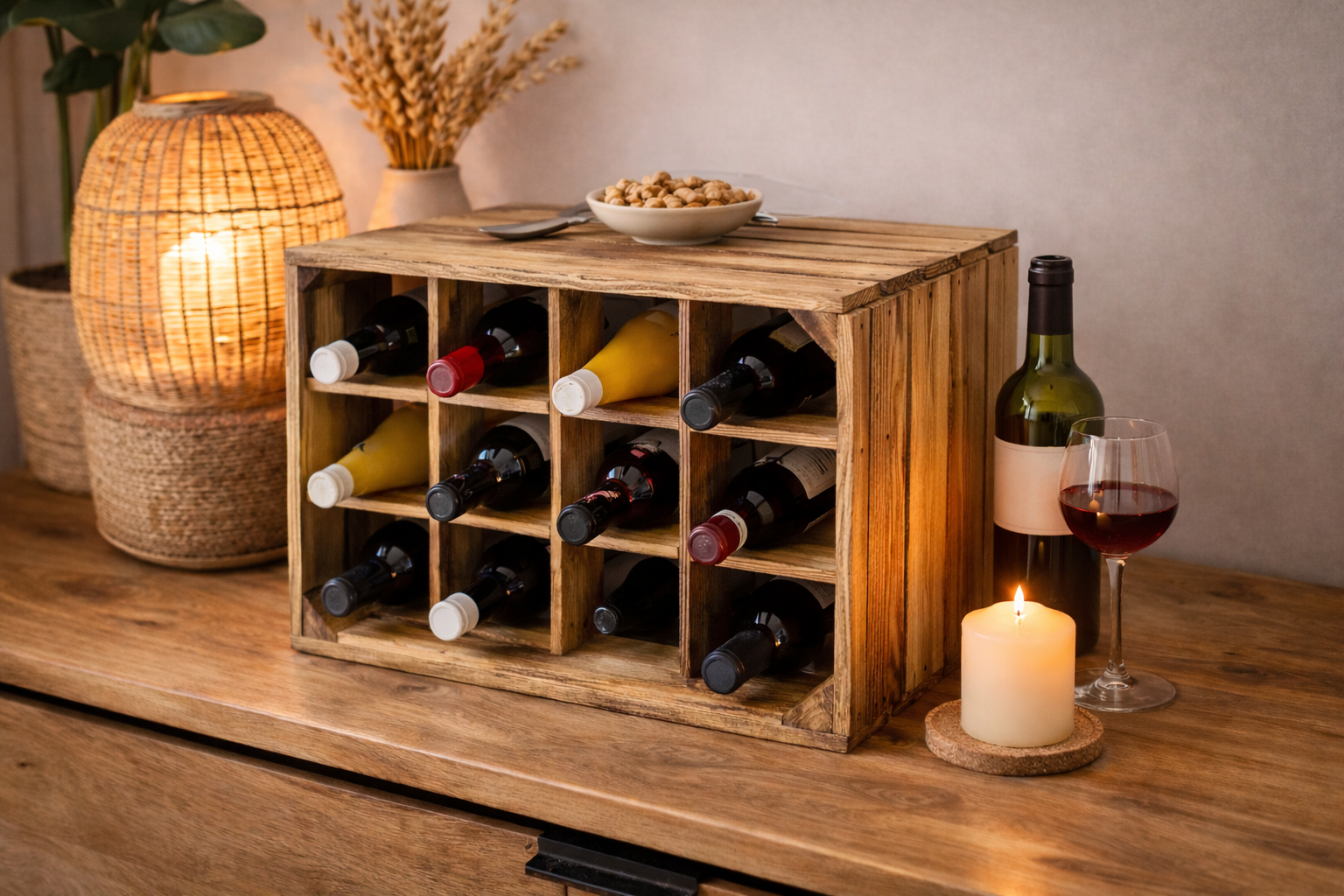 Neben den originalen Holzkisten bieten wir auch neue, geflammte und farbige Kisten, die frische Akzente setzen und Ihrem Zuhause einen individuellen Look verleihen.
