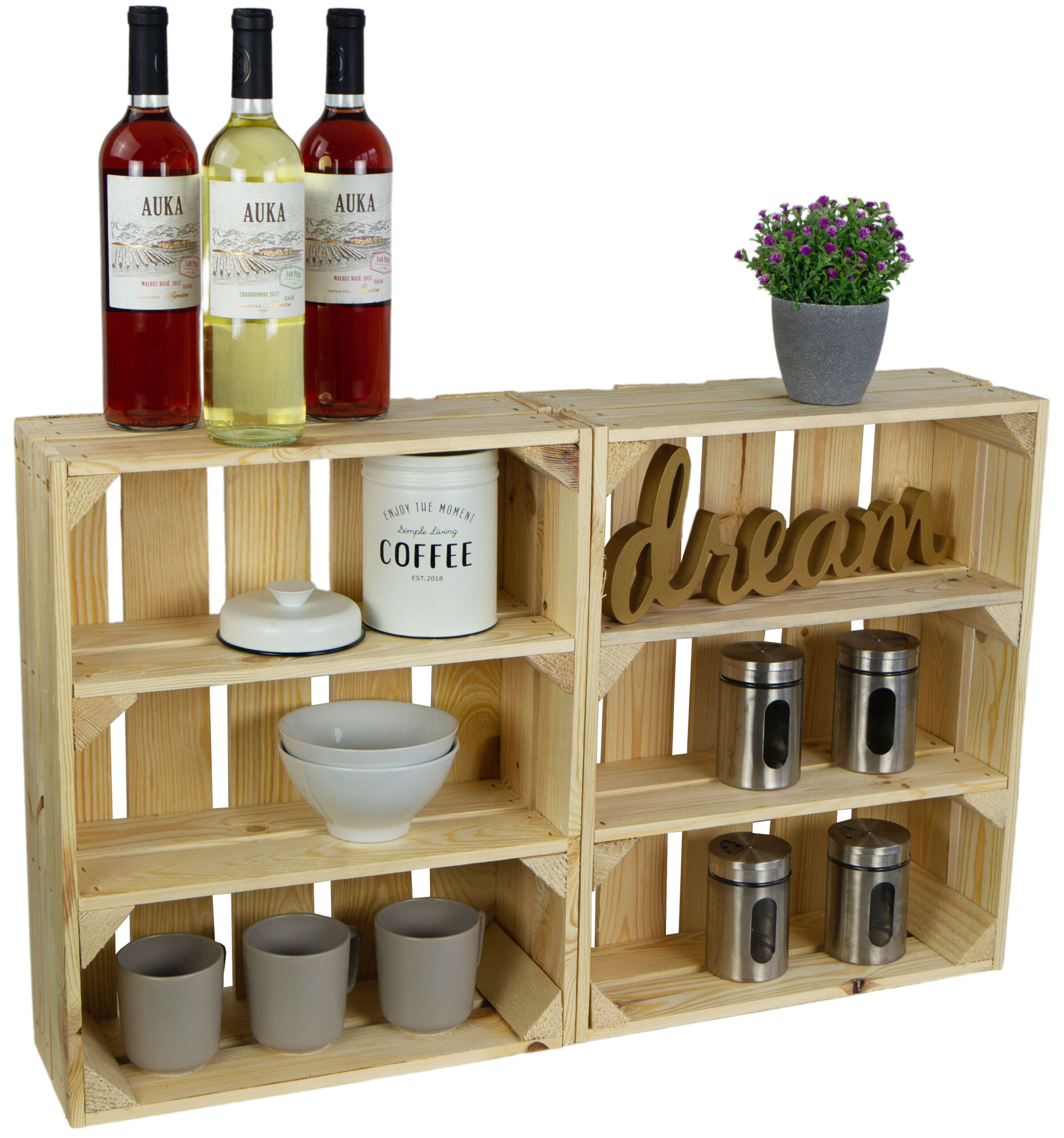 Unser flaches Obstkistenregal Wilma sorgt für wunderbare, stylische Ordnung in Ihrem Haus/Wohnung, sowie Garten.