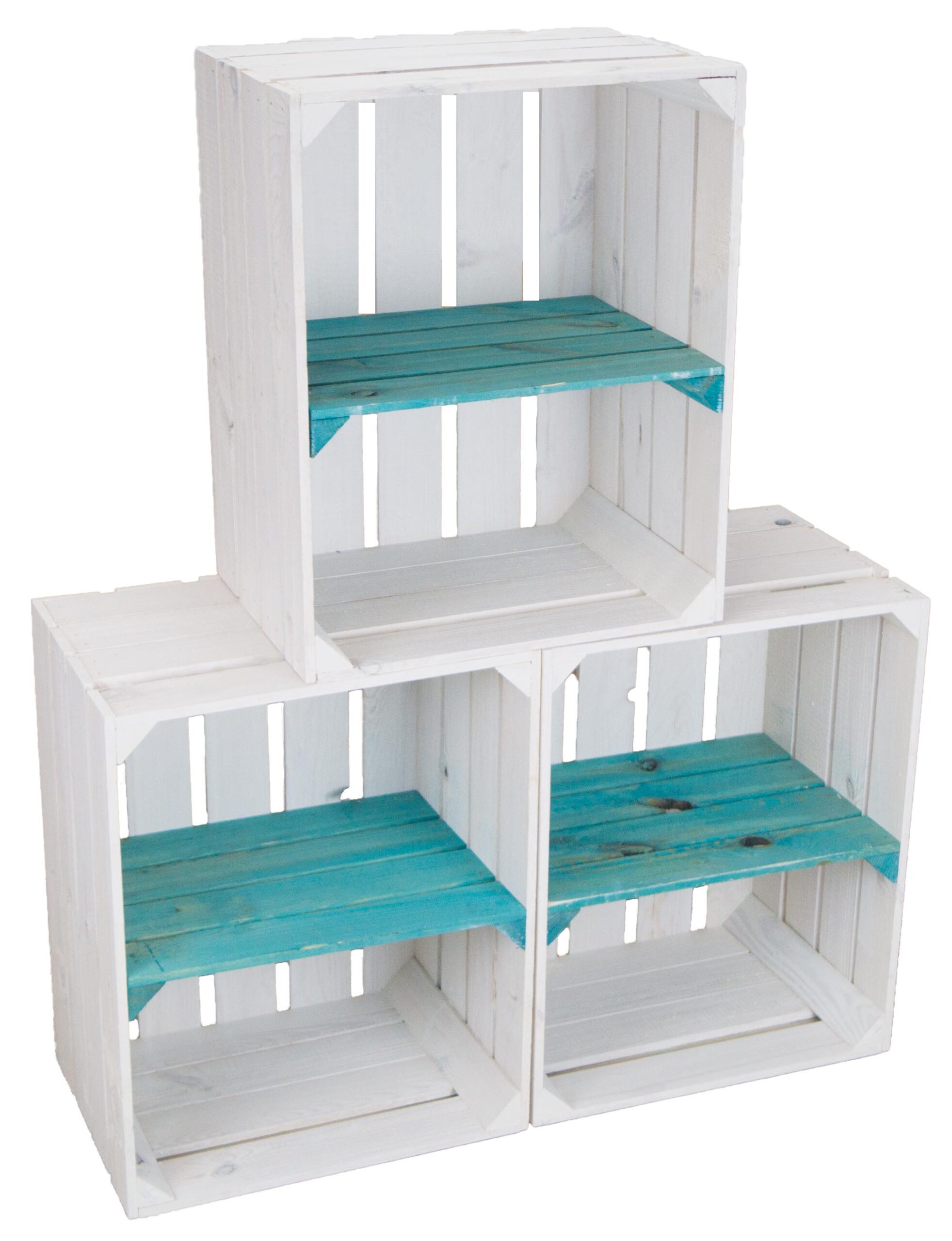 3er set Regalkiste Johanna weiß lasiert mit türkisem Querbrett
