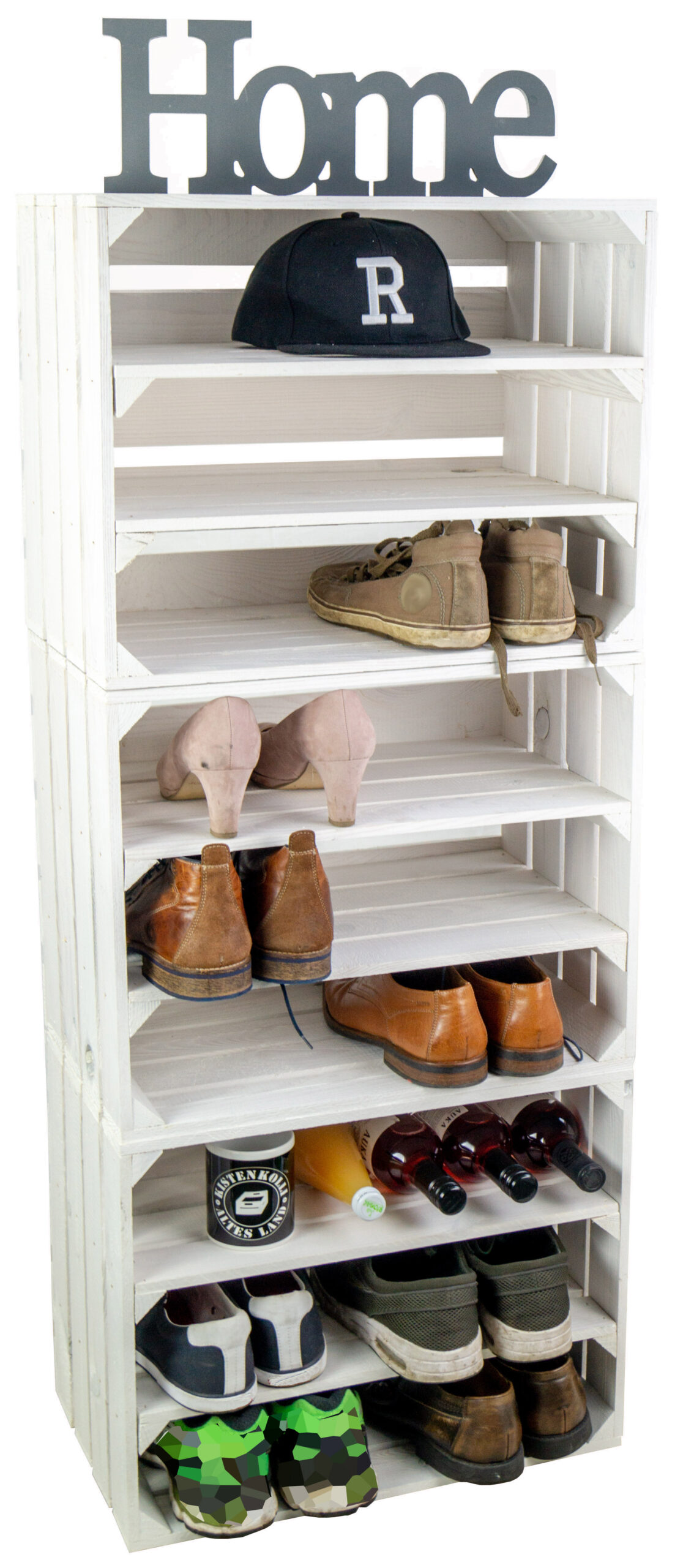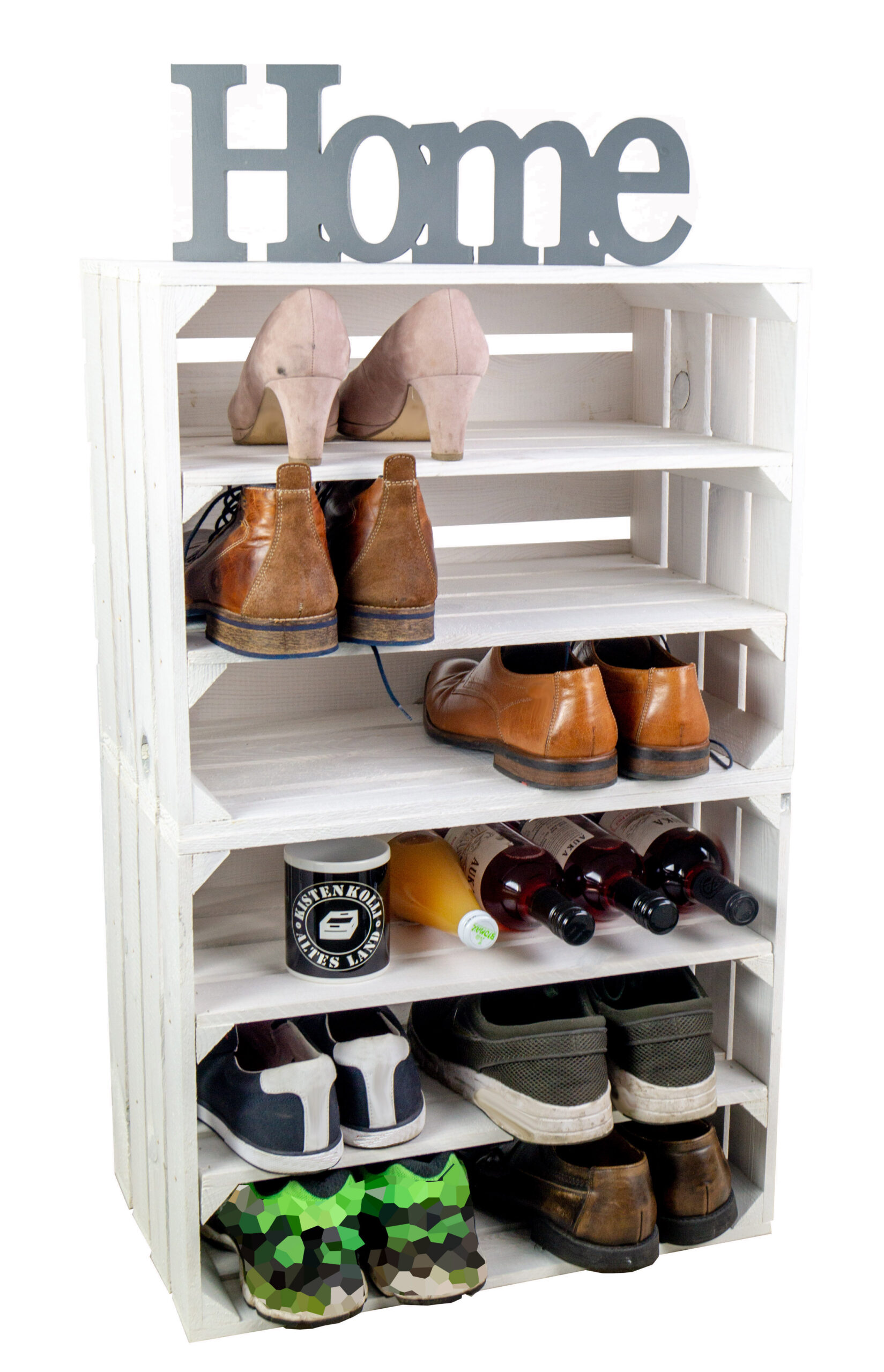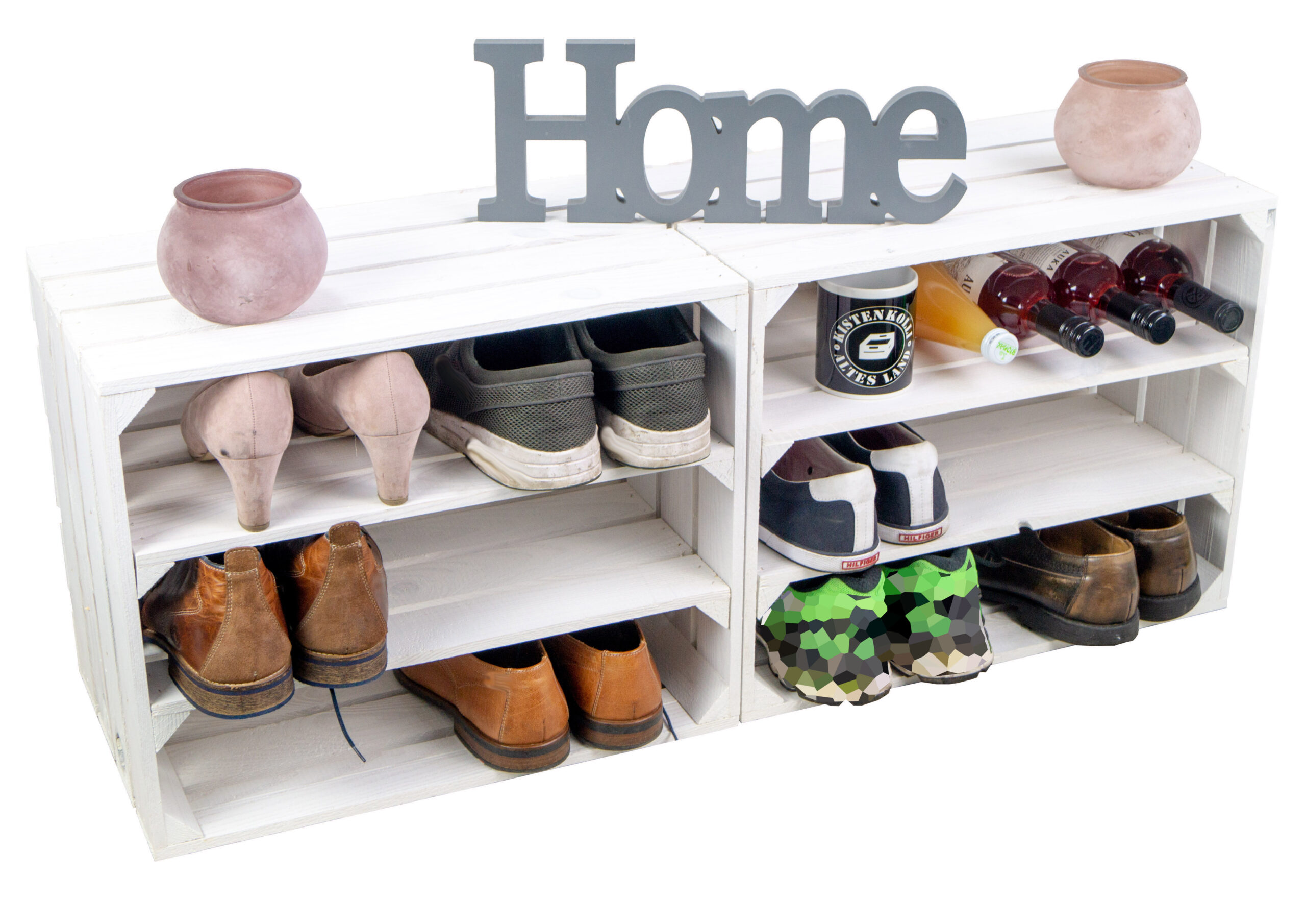 Tolle Regalkisten für Ihr zu Hause, diese neue Design hat nun bereits zwei montierte Mittelbretter in der Kiste, somit noch mehr Stauraum pro Kiste für Ihre Schuhe. Durch die etwas geringere Höhe pro Fach (ca. 12cm) passen Vorzugsweise nur flache Sneaker oder Halbschuhe in die Fächer. Passende Kisten mit einer Quereinlage oder nur einem Mittelbrett für höhere Schuhe finden Sie auch bei uns, so können Sie diese Kisten wunderbar mit unseren anderen Ausführungen kombinieren. Auch als Weinregal oder Weinschrank wunderbar zu benutzen, die Kisten sind stabil genug um diese komplett mit Weinflaschen zu füllen. Wenn man alle drei Kisten übereinander stellt sollte man diese jedoch an der Wand (mit schrauben) sichern um ein mögliches umkippen zu vermeiden.