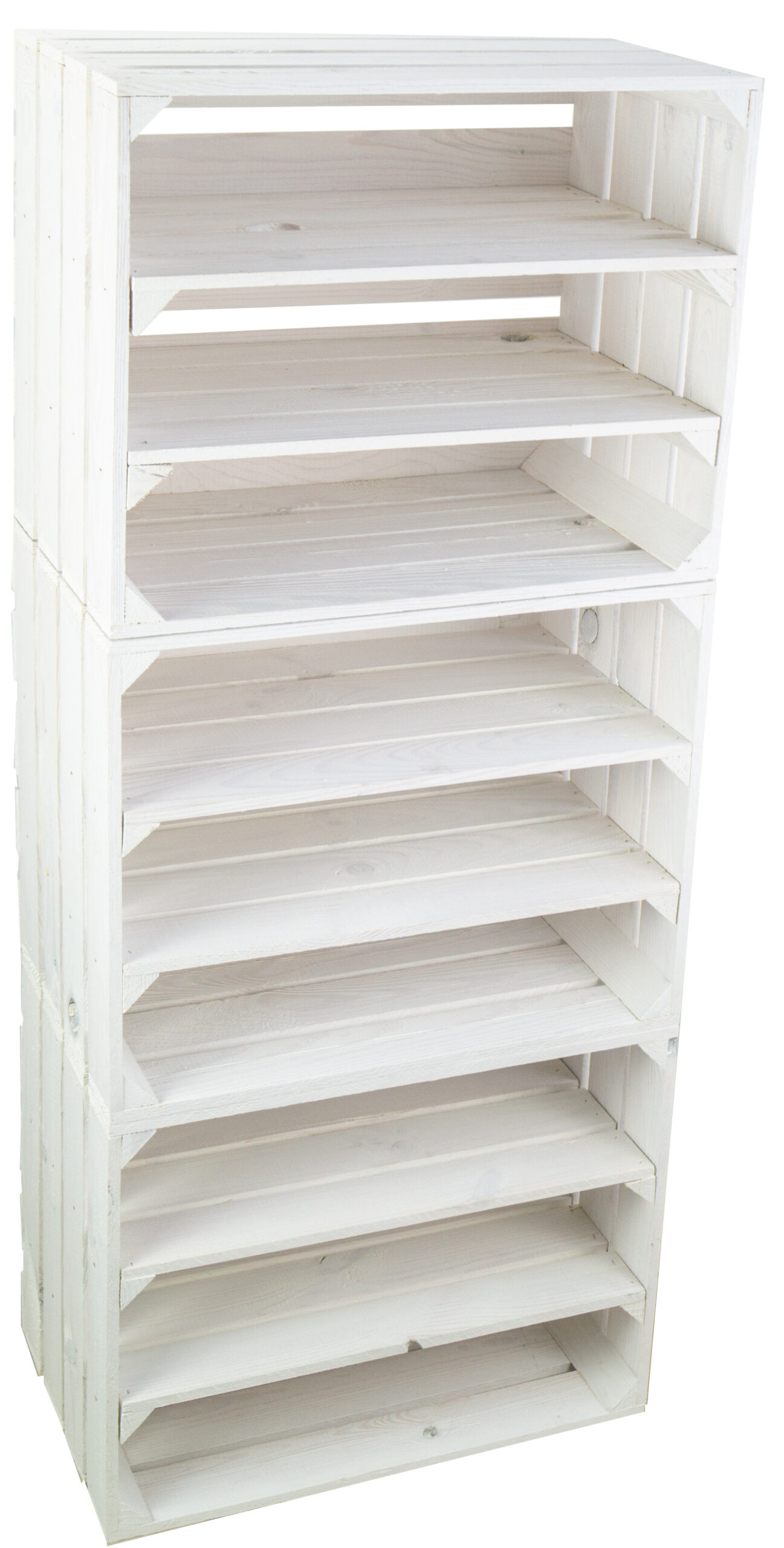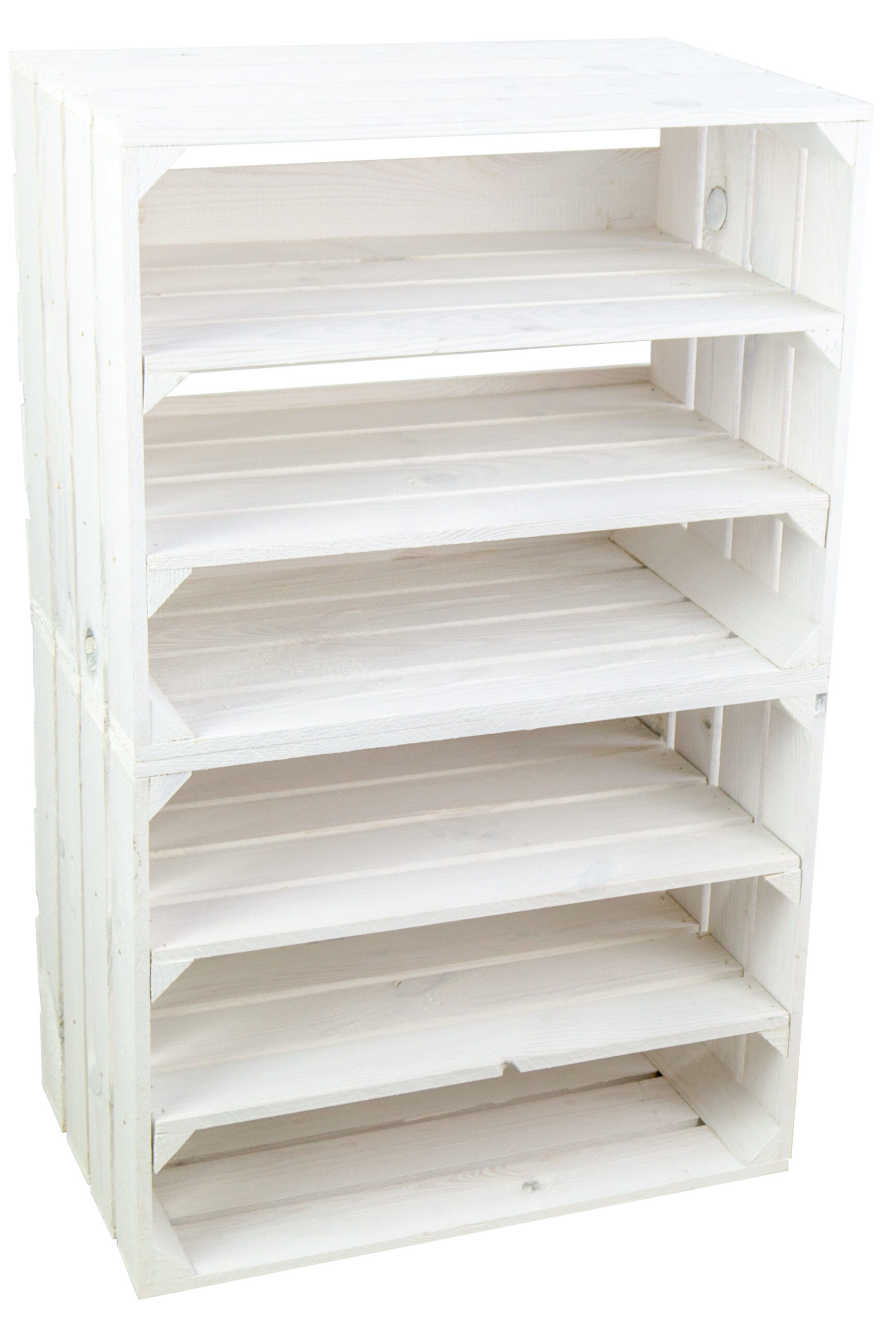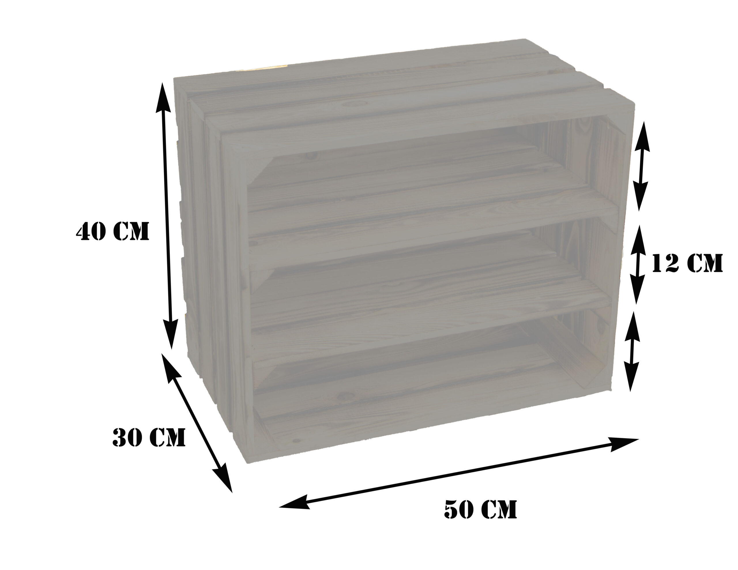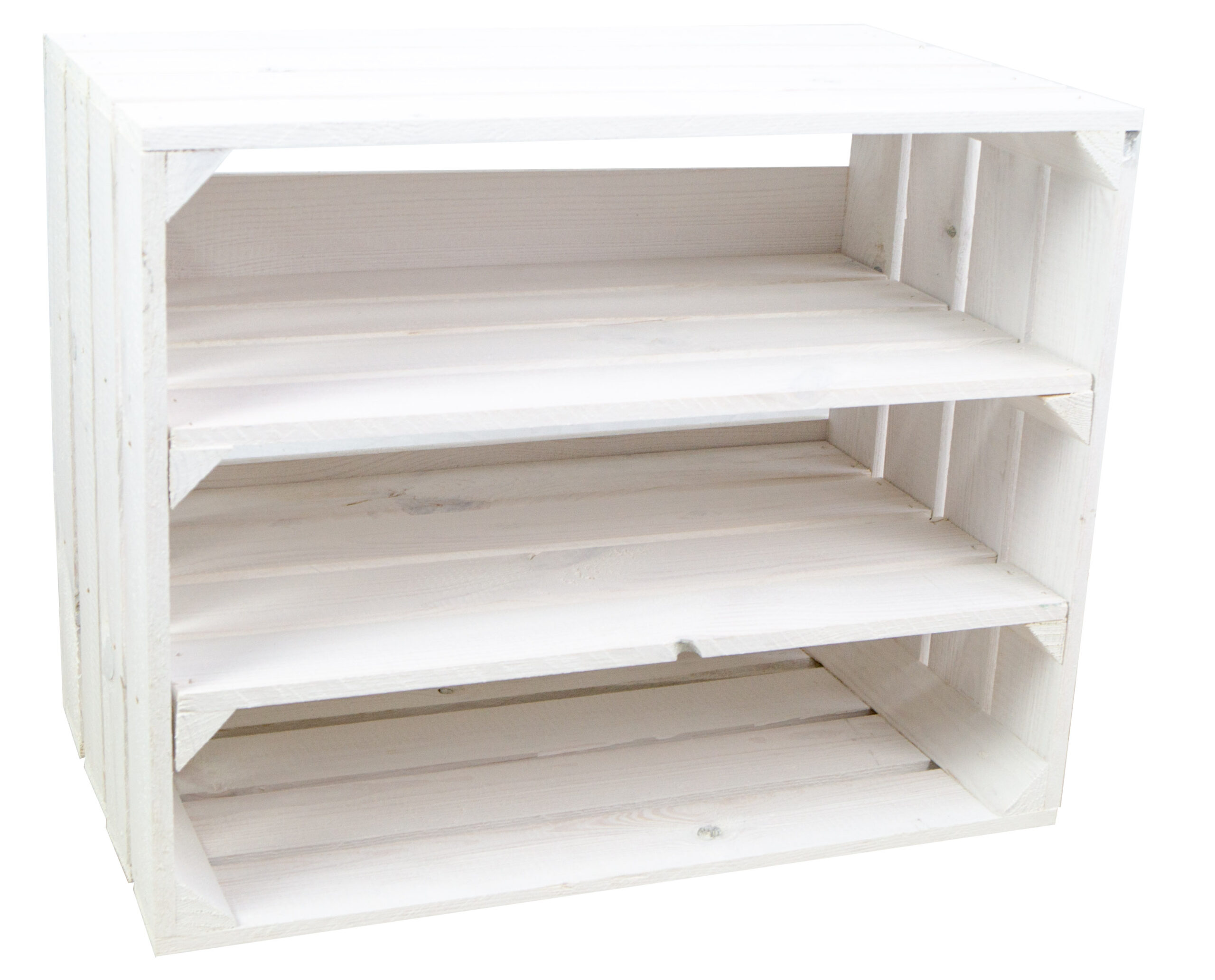 Tolle Regalkisten für Ihr zu Hause, diese neue Design hat nun bereits zwei montierte Mittelbretter in der Kiste, somit noch mehr Stauraum pro Kiste für Ihre Schuhe. Durch die etwas geringere Höhe pro Fach (ca. 12cm) passen Vorzugsweise nur flache Sneaker oder Halbschuhe in die Fächer. Passende Kisten mit einer Quereinlage oder nur einem Mittelbrett für höhere Schuhe finden Sie auch bei uns, so können Sie diese Kisten wunderbar mit unseren anderen Ausführungen kombinieren. Auch als Weinregal oder Weinschrank wunderbar zu benutzen, die Kisten sind stabil genug um diese komplett mit Weinflaschen zu füllen. Wenn man alle drei Kisten übereinander stellt sollte man diese jedoch an der Wand (mit schrauben) sichern um ein mögliches umkippen zu vermeiden.