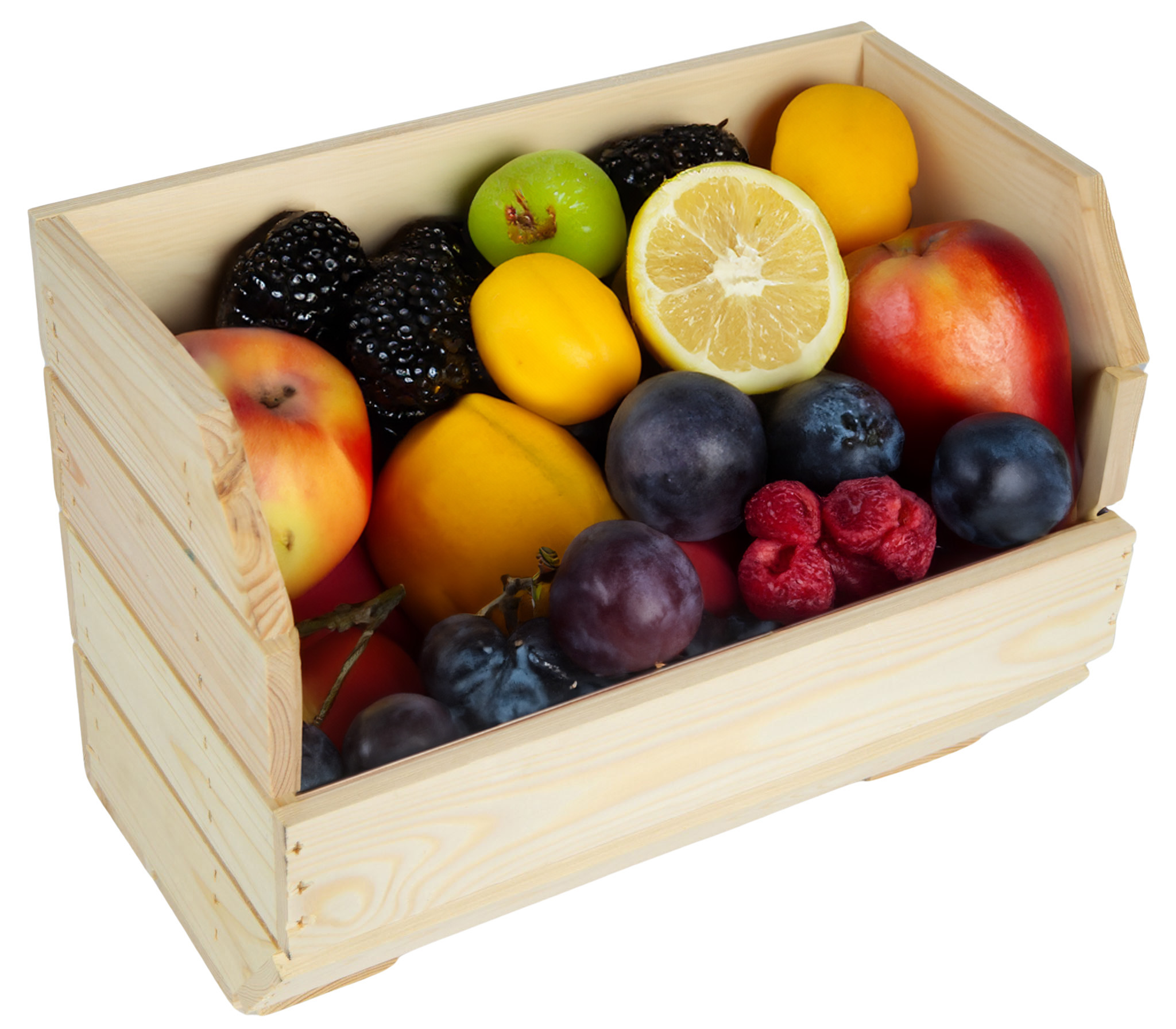 An einer Seite ist die Kiste mit einer leicht geneigten Öffnung versehen – dies ermöglicht eine flexible Entnahme der Früchte.