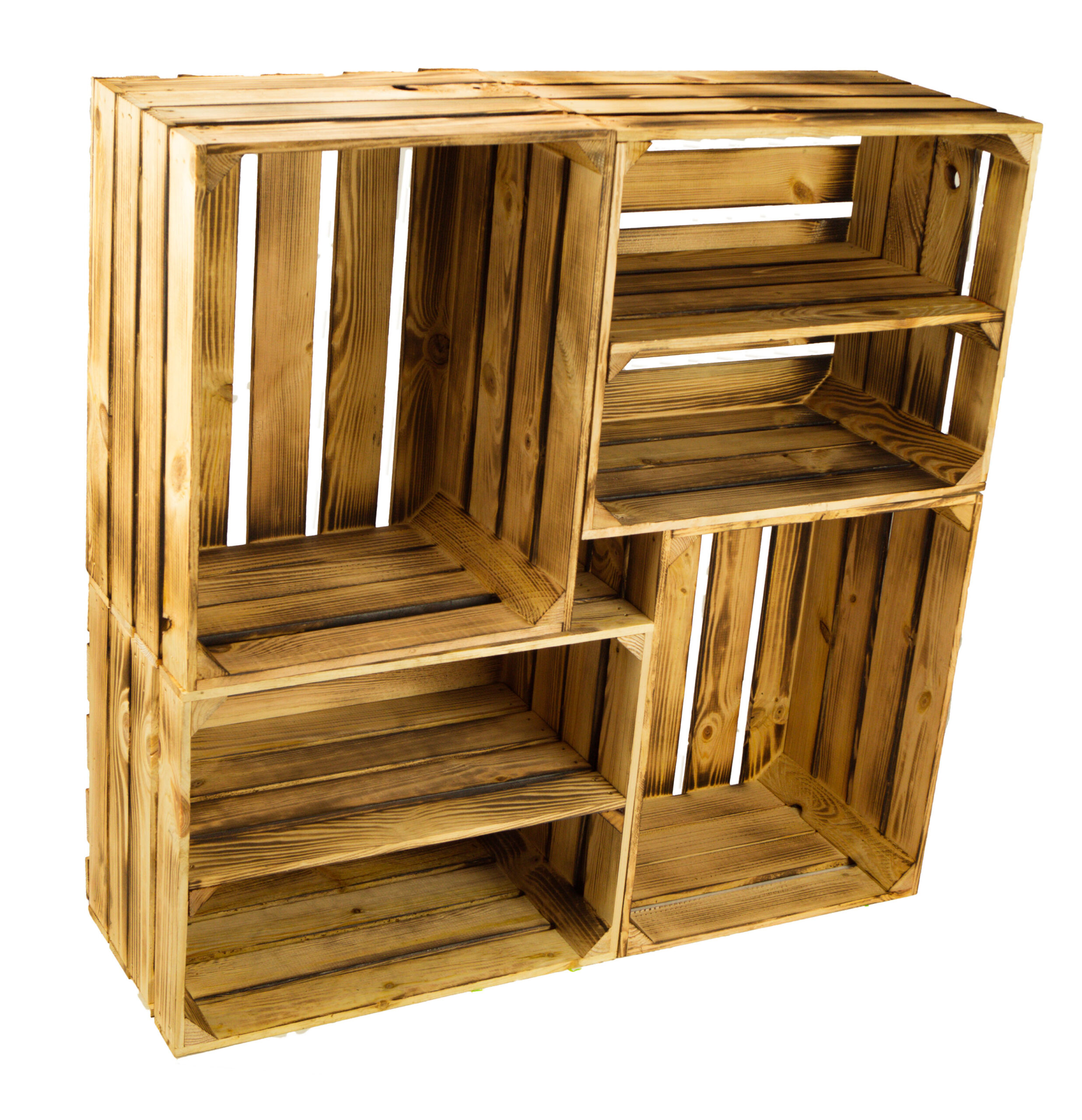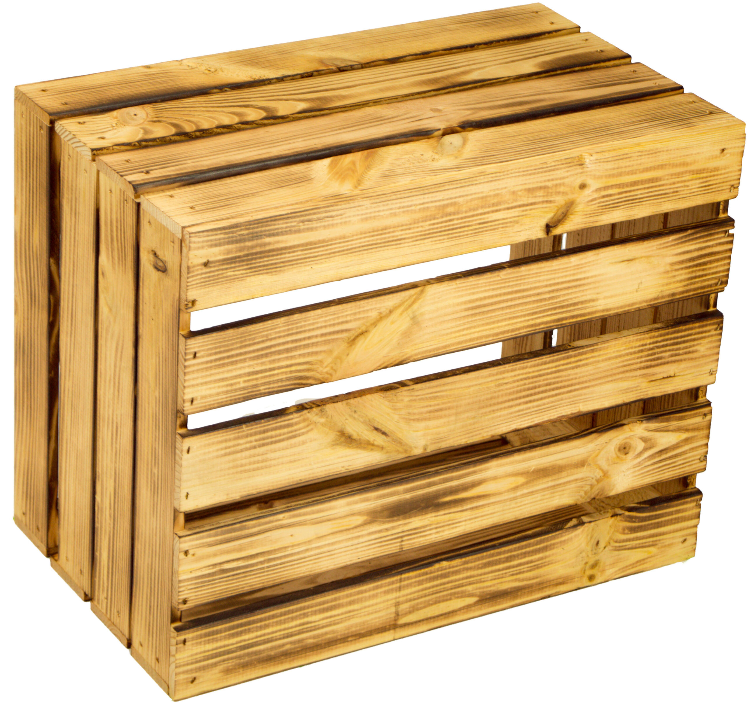 Diese massiven Apfelkisten sind neu & gehobelt und wurden mit einem Brenner “flambiert” und haben deshalb eine ungewöhnliche, aber sehr schöne Struktur!