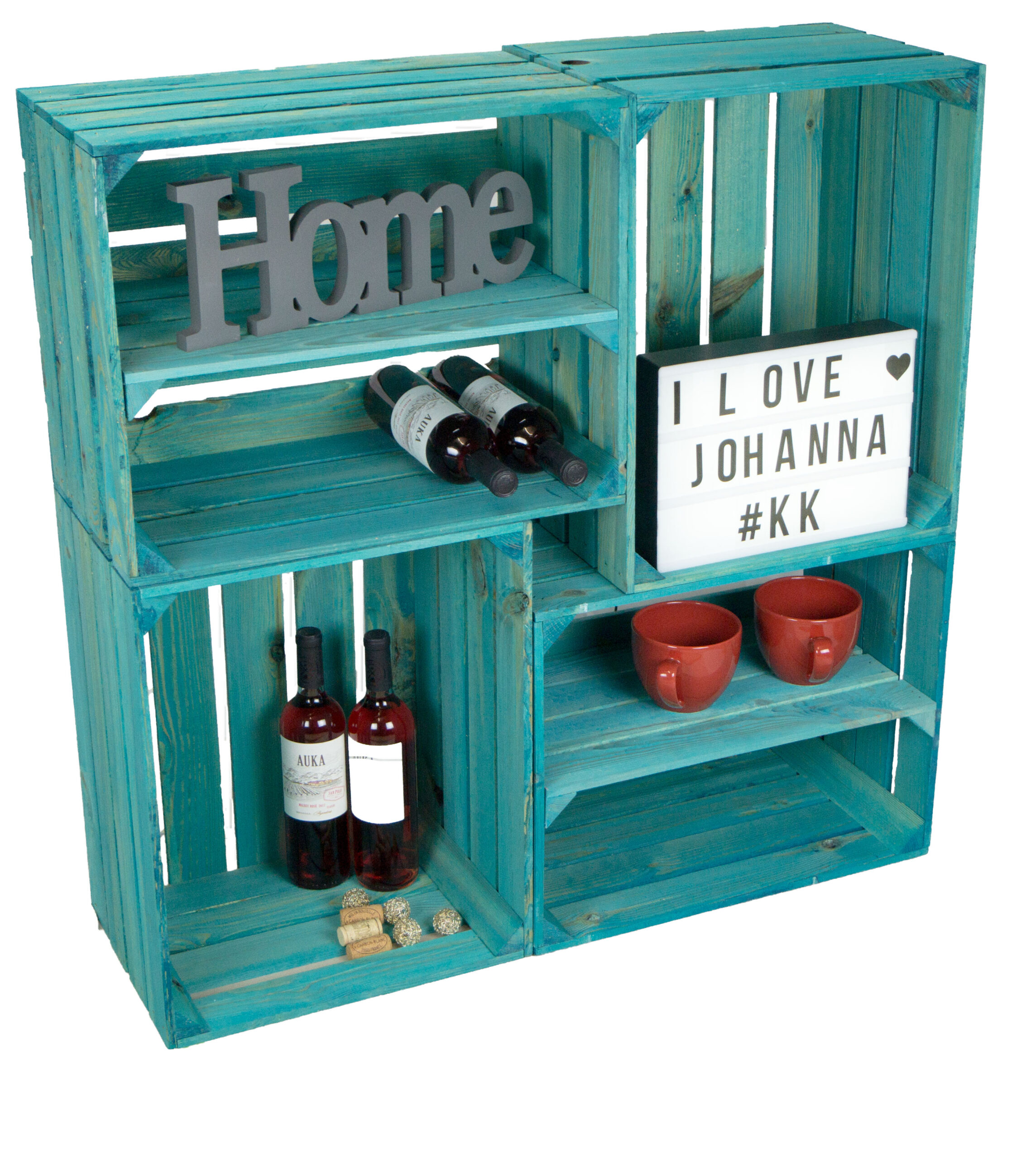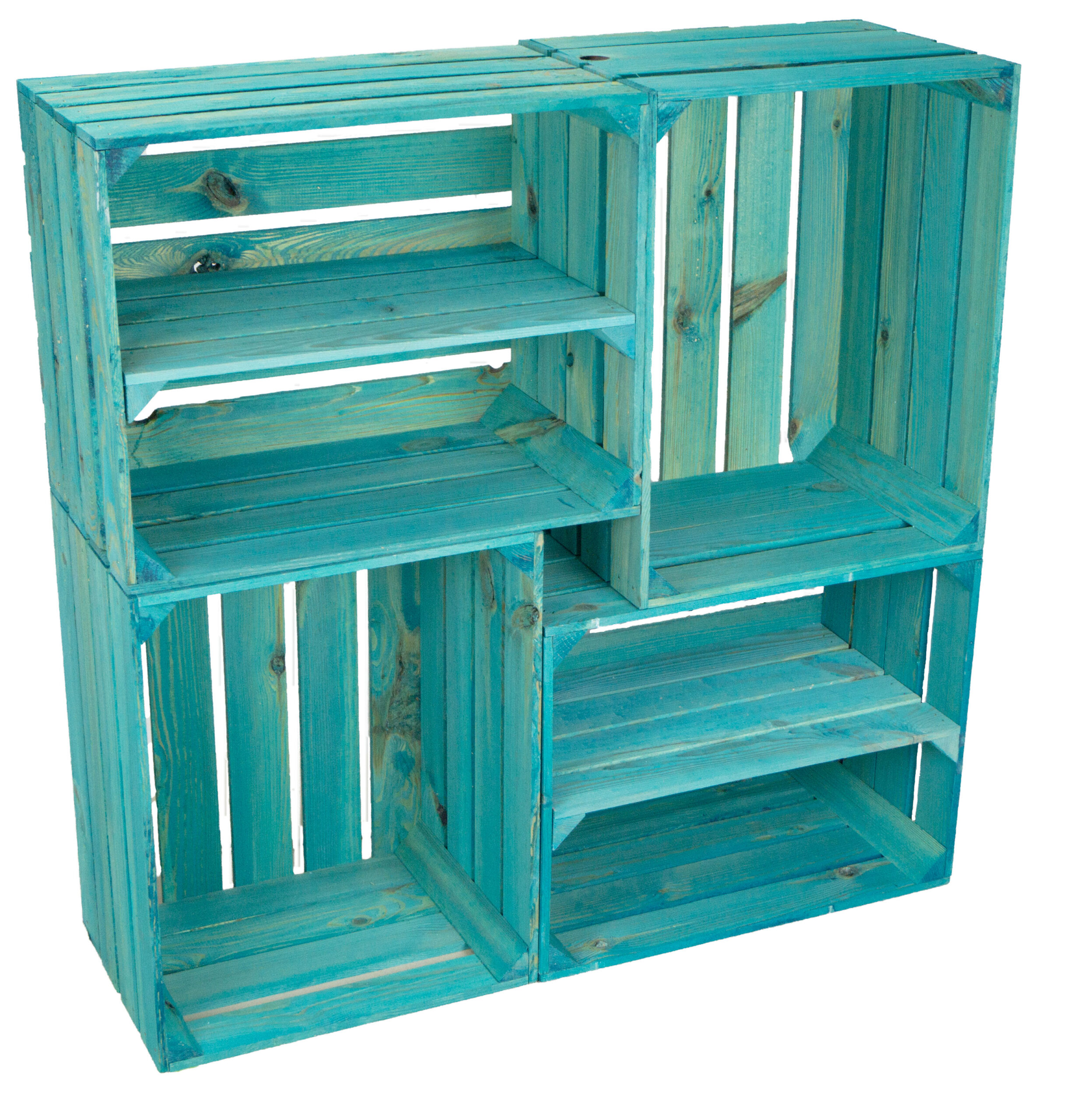 Unser 4er set im Angebotsset, bestehend aus 4 Türkis lasierten Obstkisten, wovon 2 Kisten ein bereits montiertes Mittelbrett besitzen.