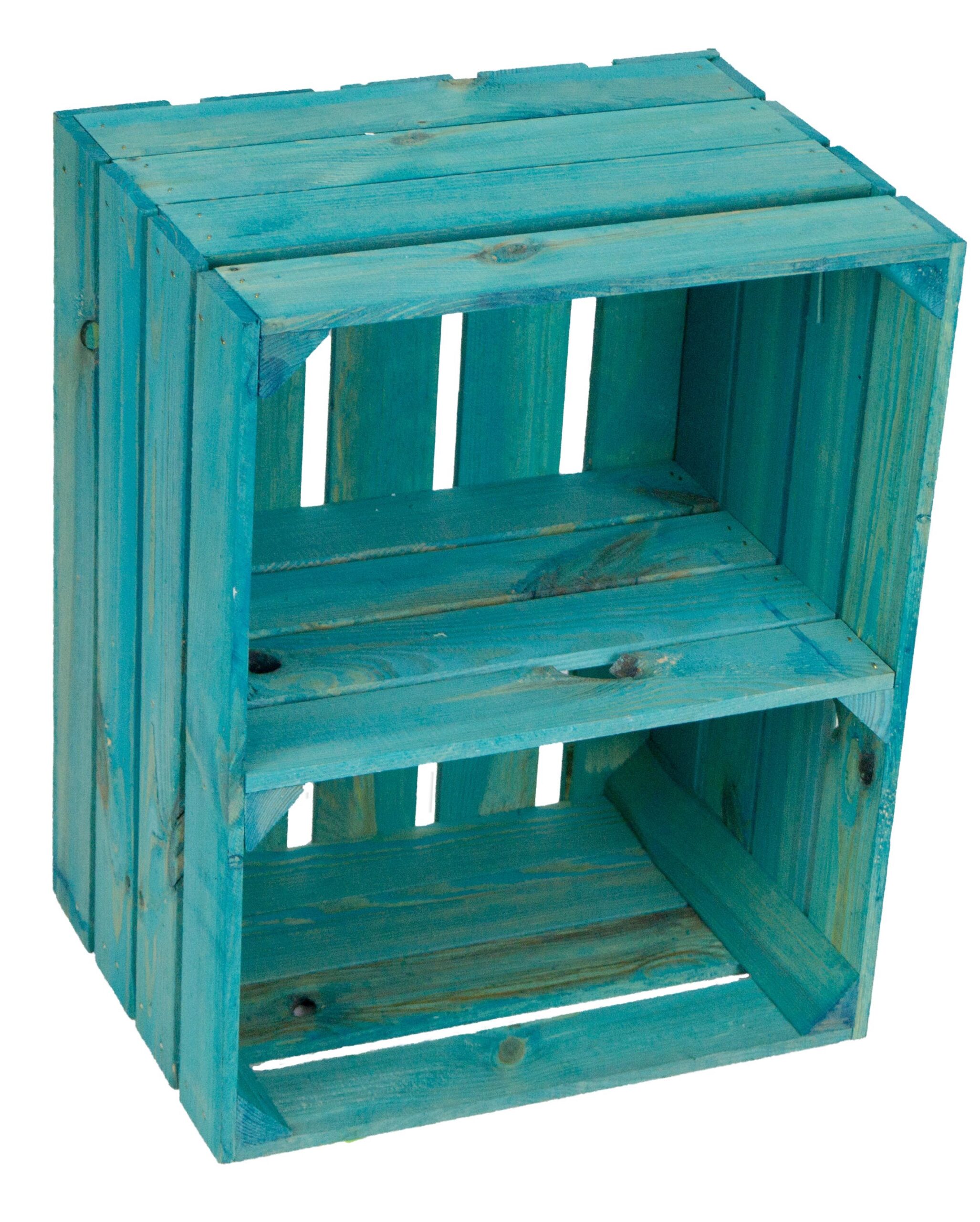 Unser 4er set im Angebotsset, bestehend aus 4 Türkis lasierten Obstkisten, wovon 2 Kisten ein bereits montiertes Mittelbrett besitzen.
