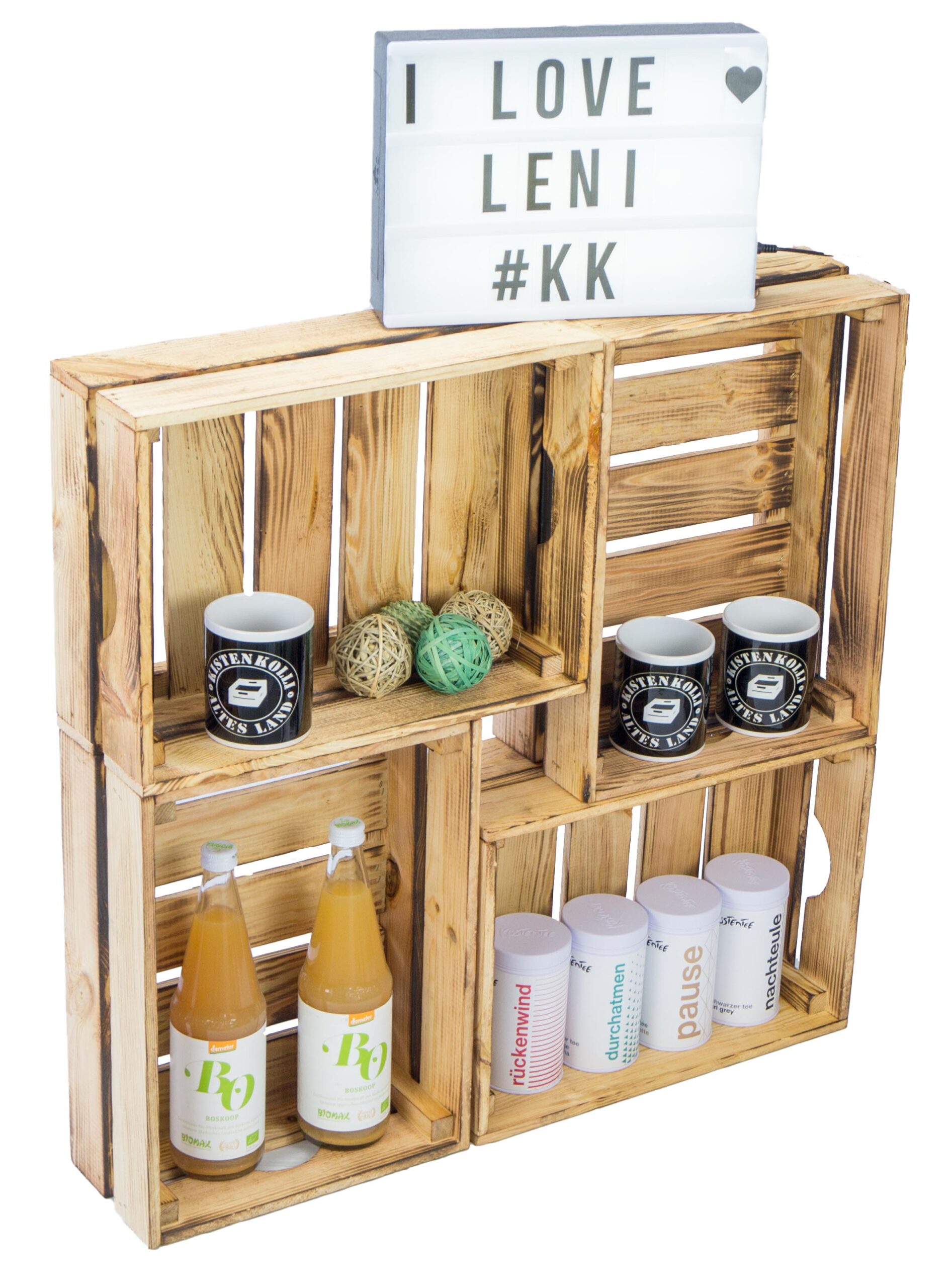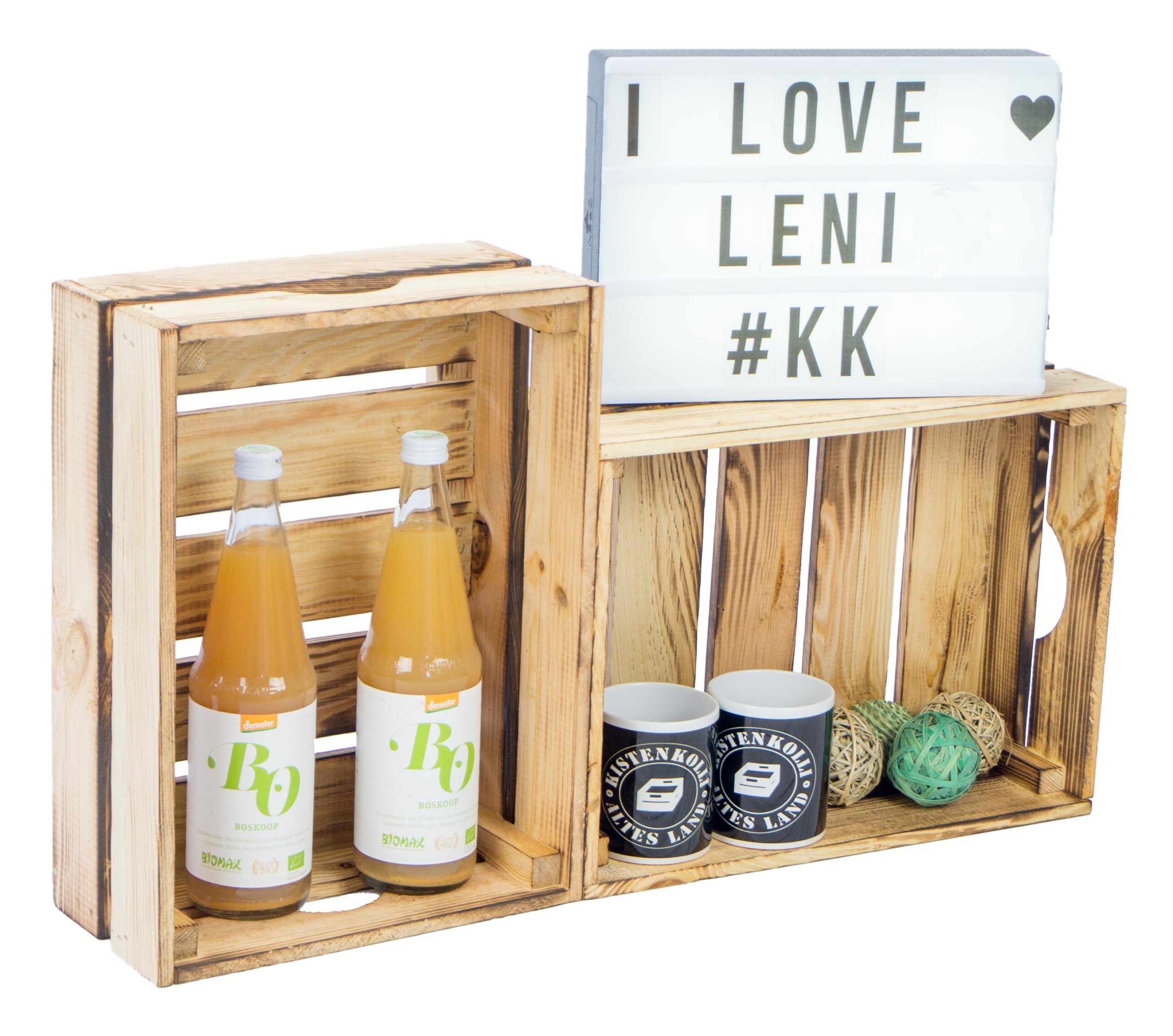 Achtung: Geflammte Kisten: Durch das abflammen der Kiste ensteht Russ der natürlich vor Gebrauch entfernt werden sollte.