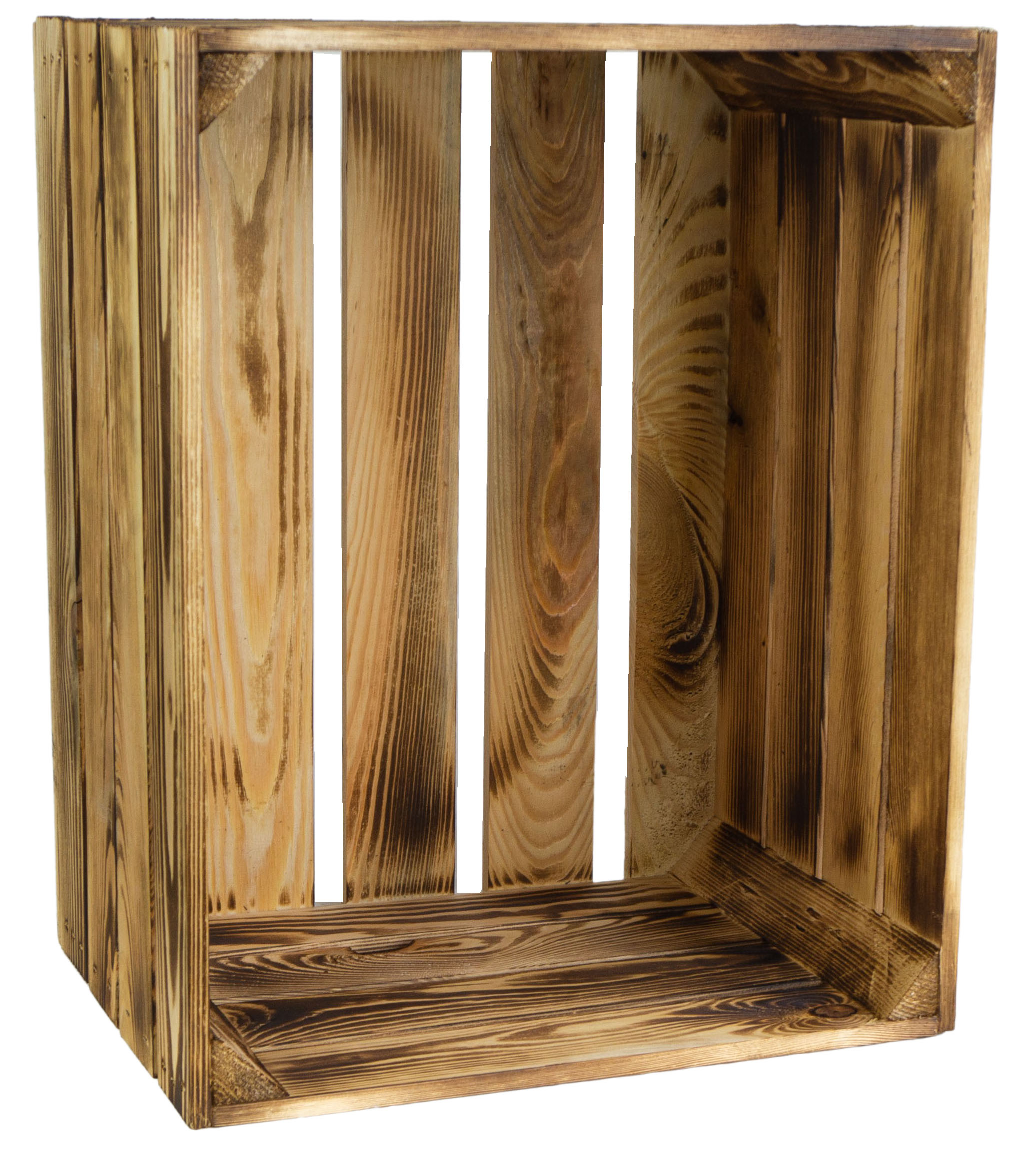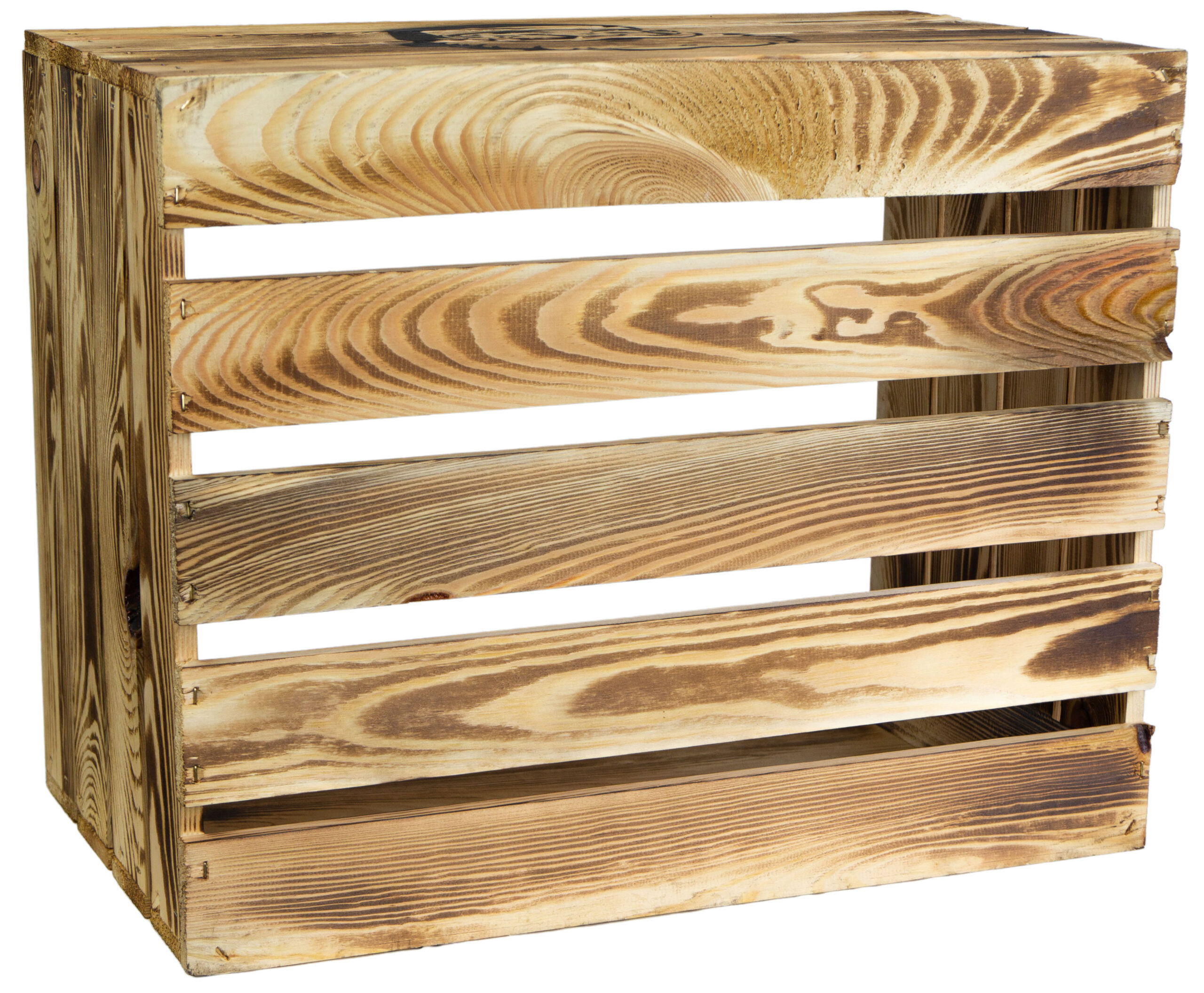 Durch das Flambieren der Kiste wird die Struktur des Holzes wunderbar hervorgehoben und es ensteht bei jeder Kiste ein einzigartiges Design.