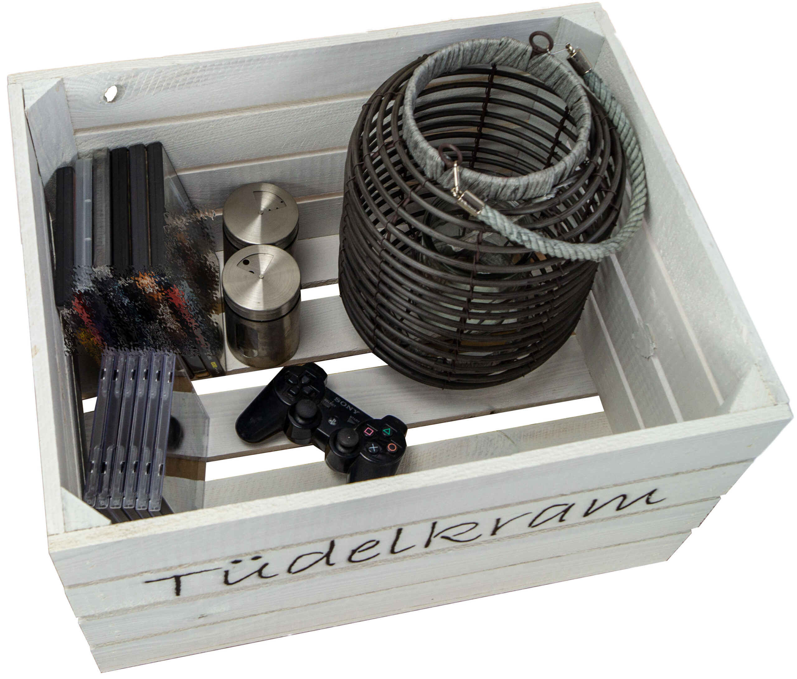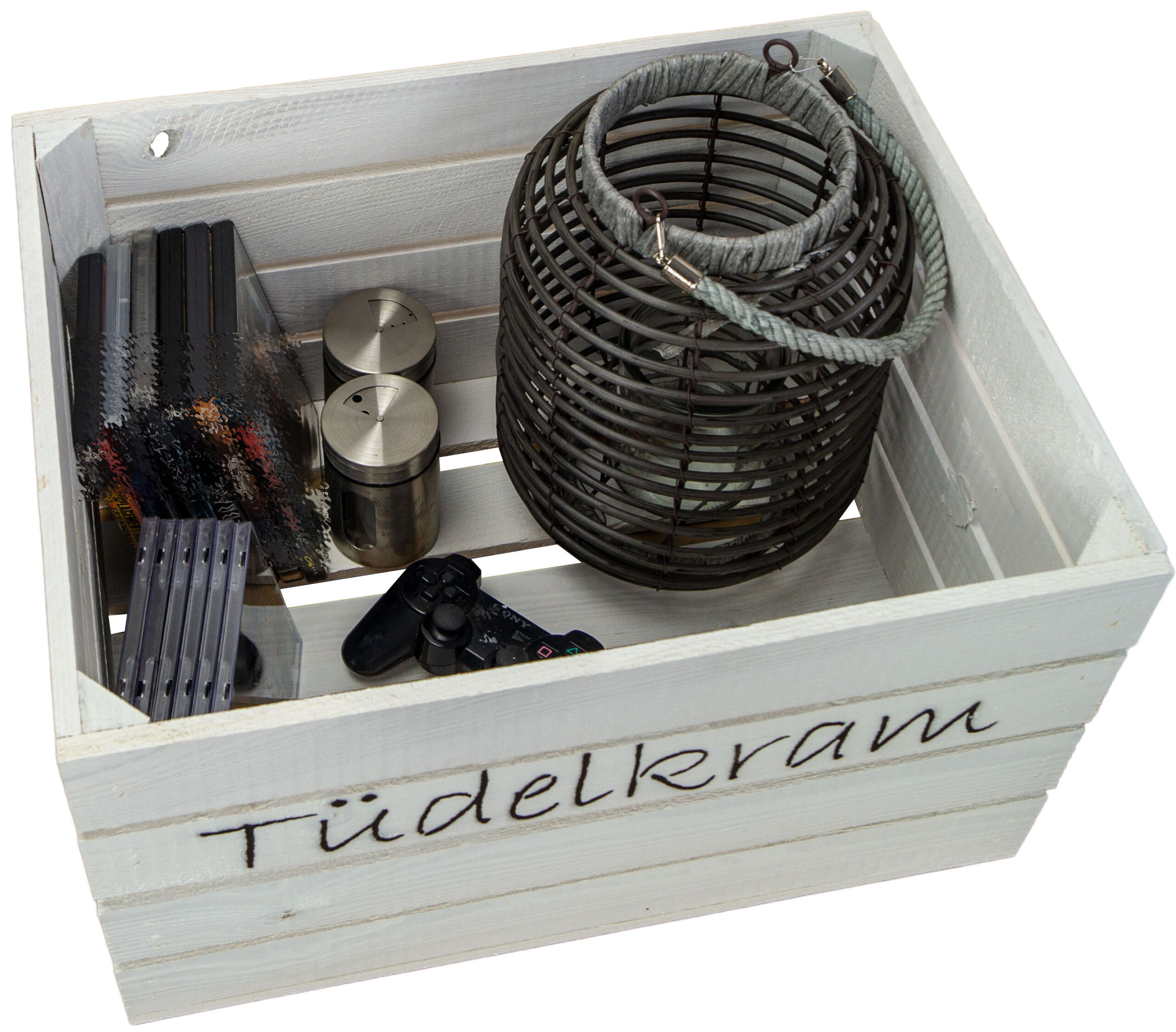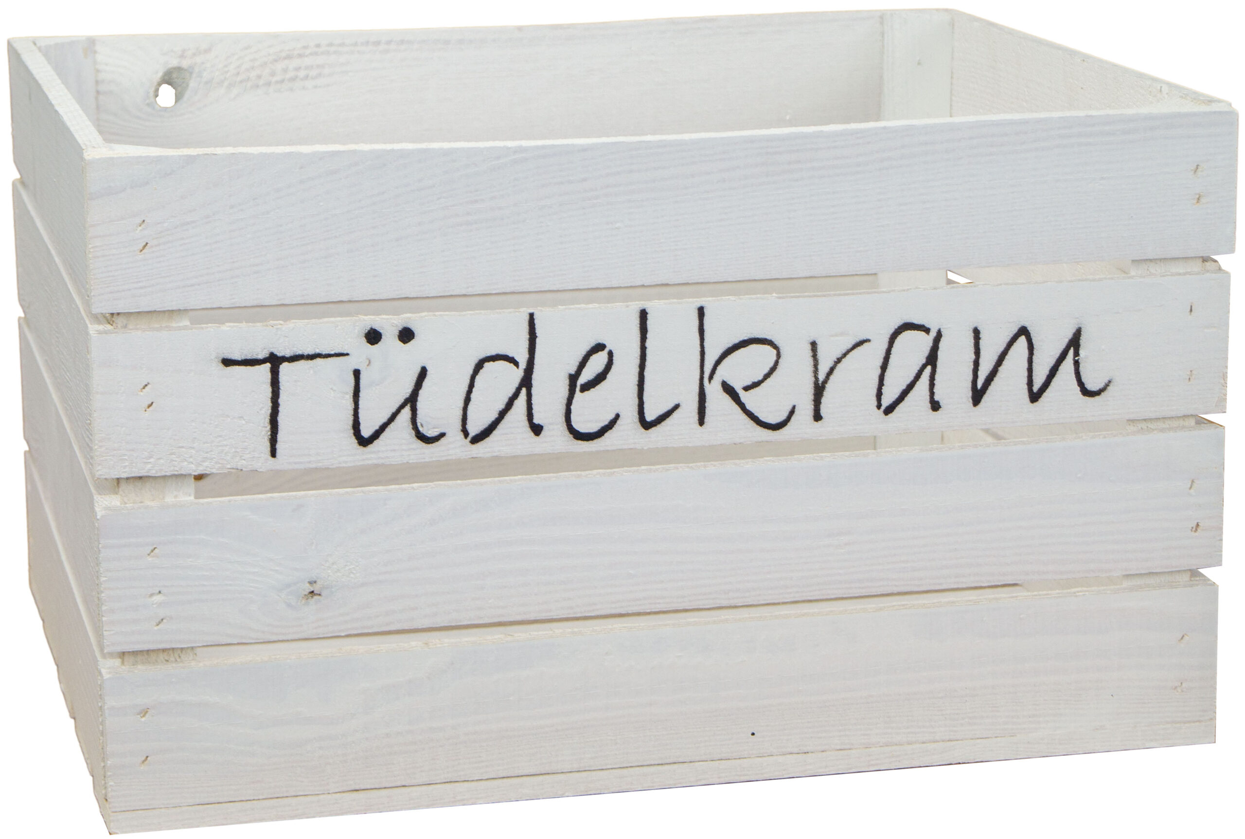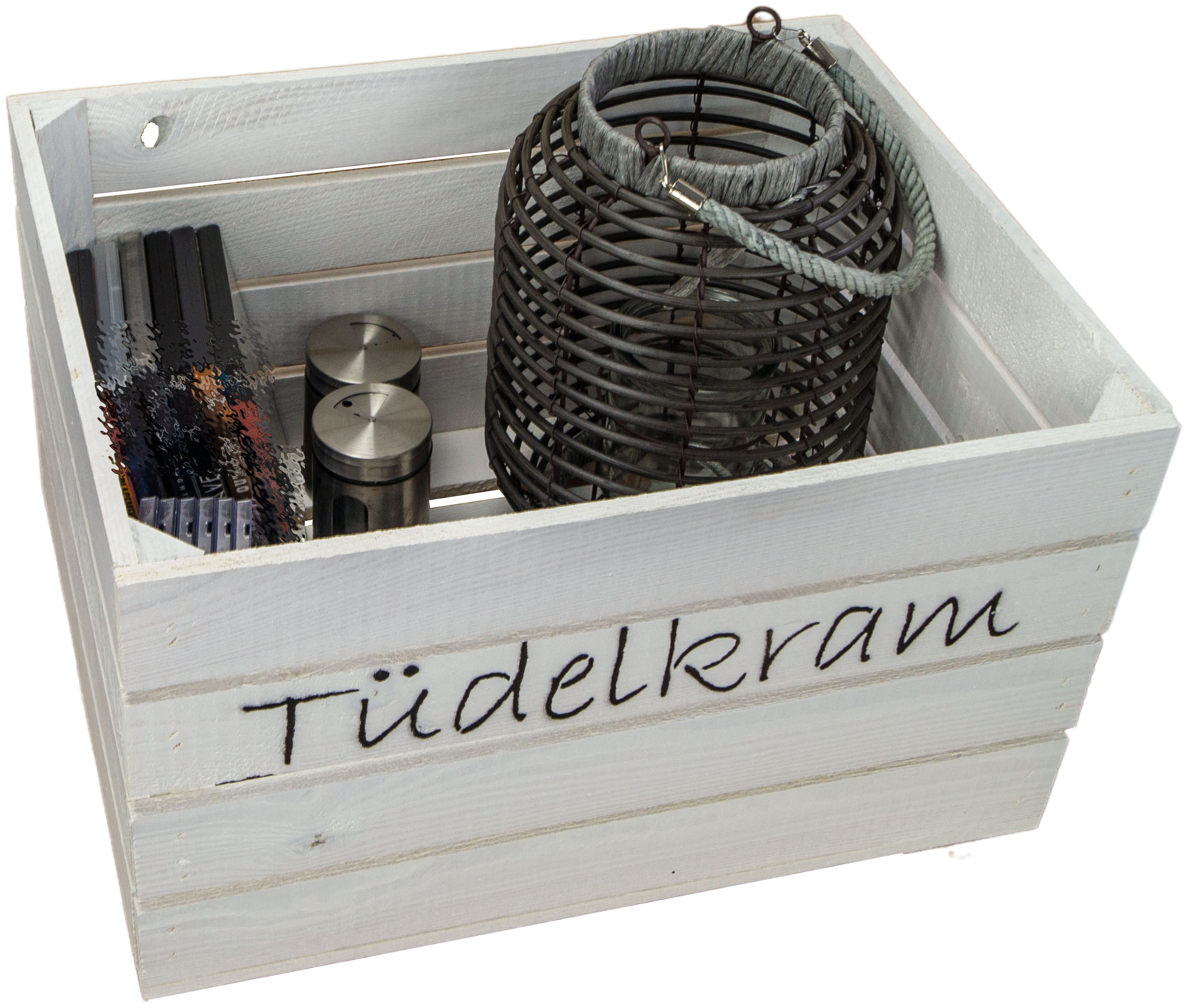 Unsere massive Johanna wurde mit einer weissen Lasur und einem wunderschönen Schriftzug "Tüdelkram" versehen.
