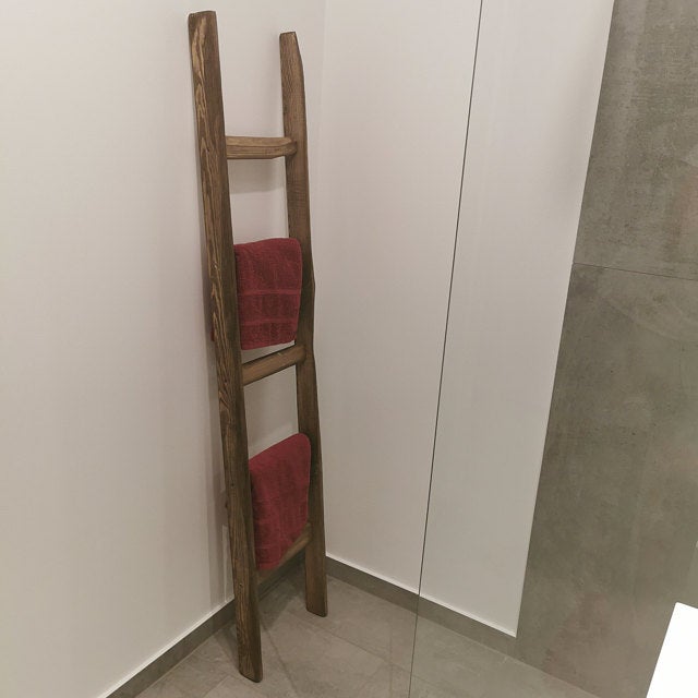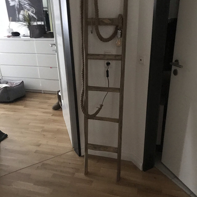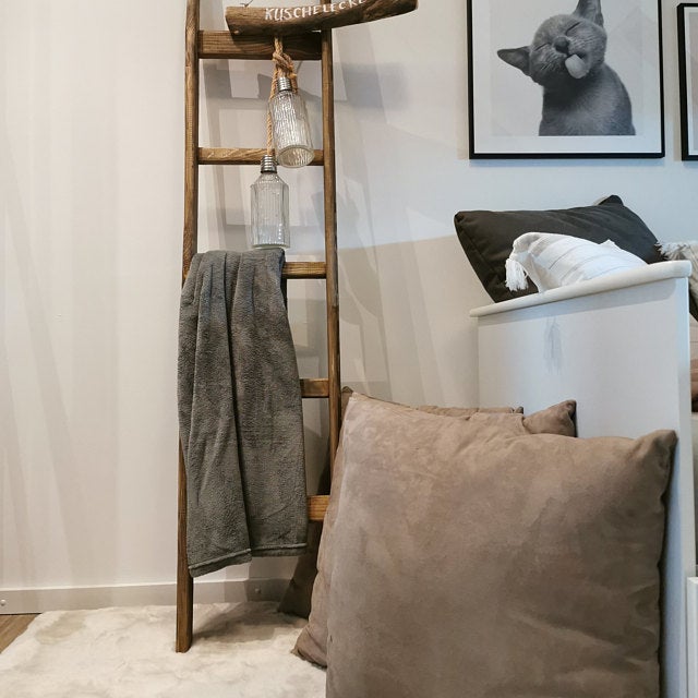 Die Holzleiter Altländer Art ist flexibel einsetzbar und es findet sich so gut wie in jedem Wohnraum ein Plätzchen, ob an der Wand oder on der Decke hängend, an die Wand gelehnt als individueller Handtuchhalter oder im Außenbereich zur Dekoration.