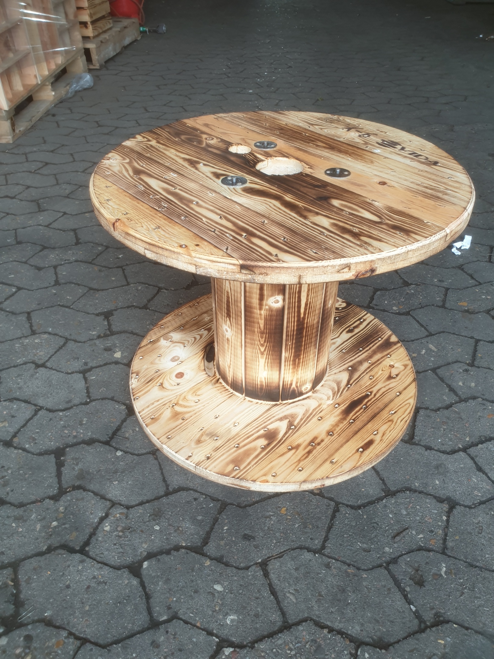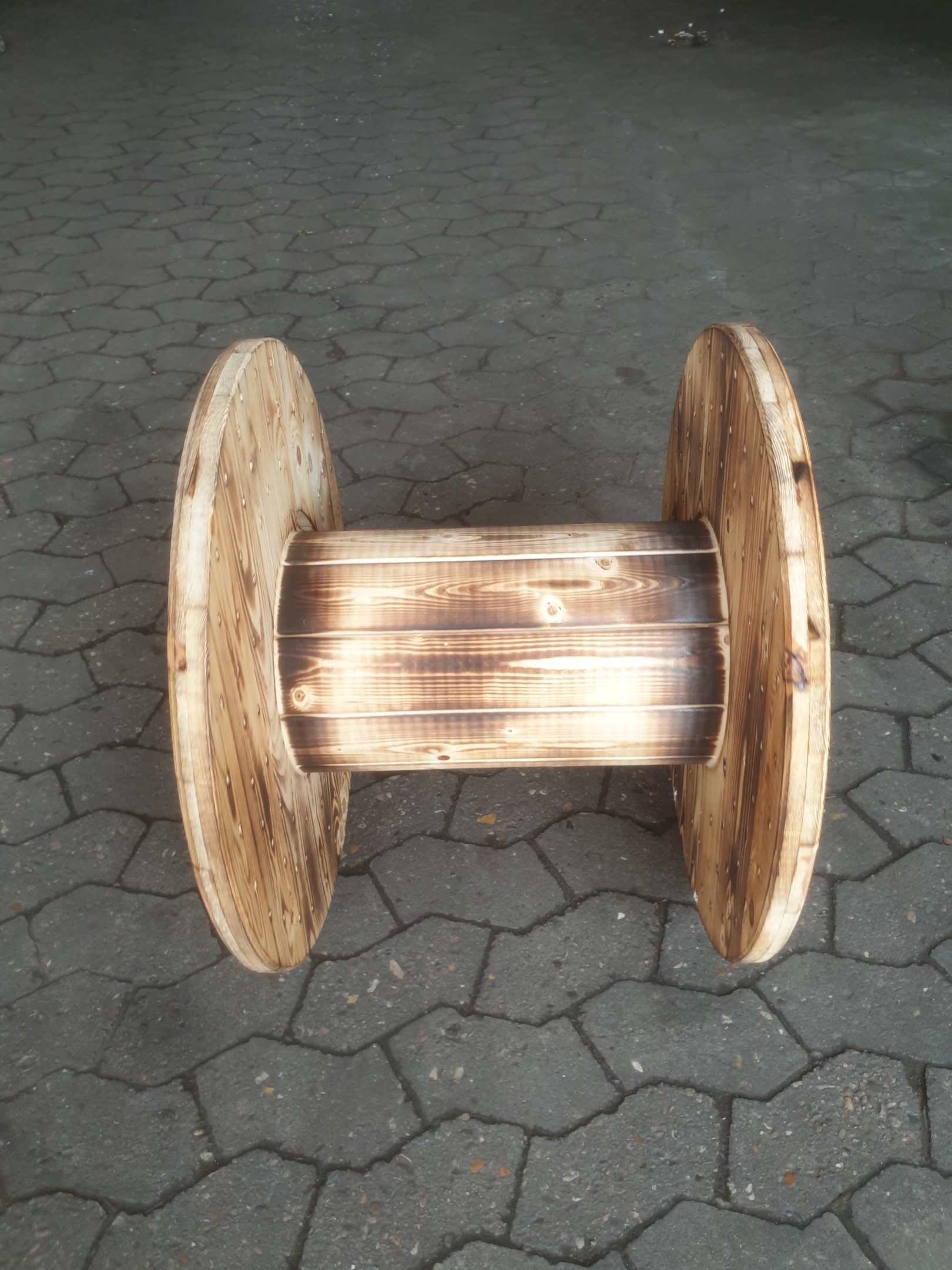 Diese originale Kabeltrommel wurde von uns flambiert und lässt sich ideal als kleiner Beistelltisch verwenden.