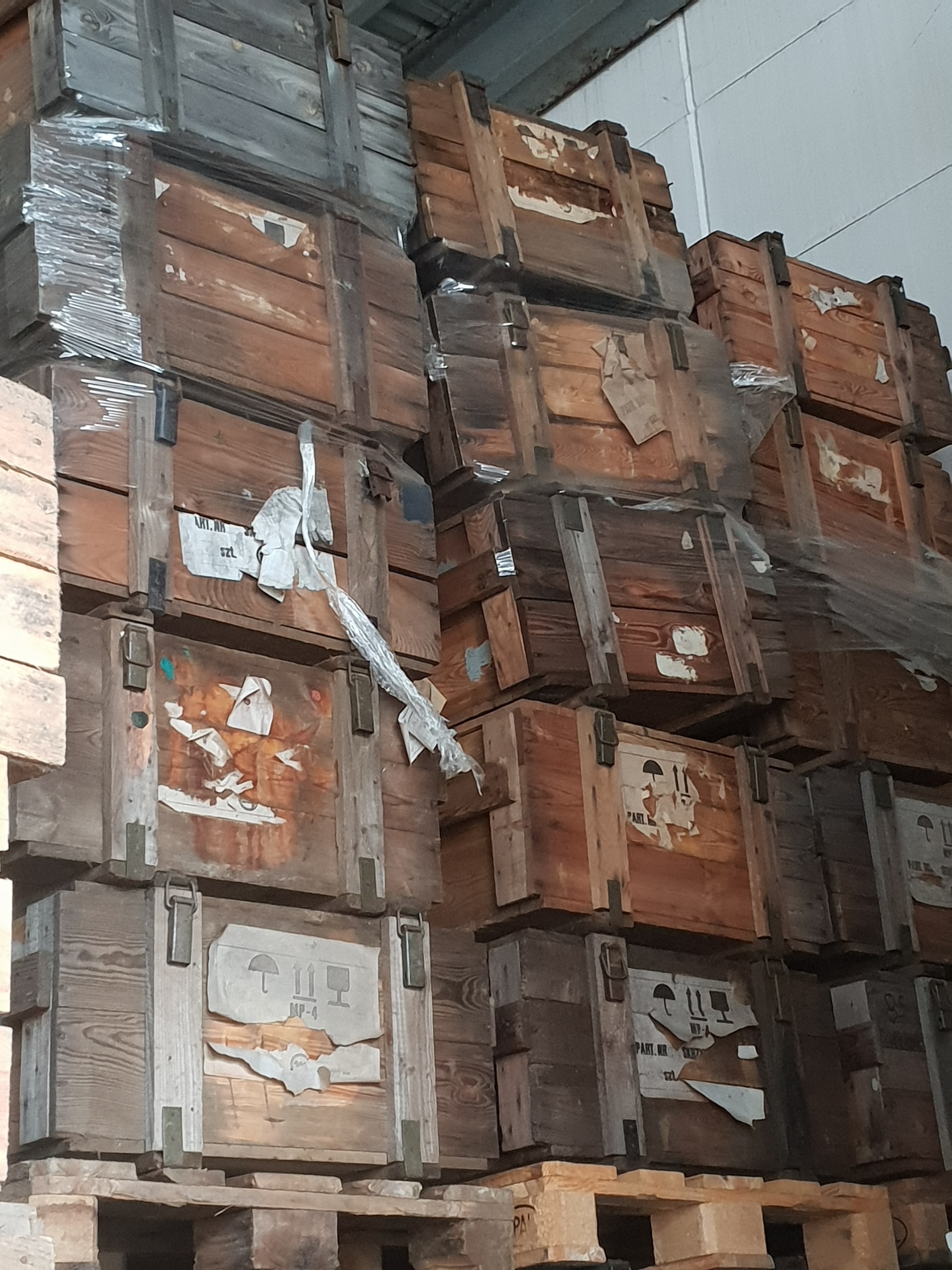 Die Kisten wurden bereits zum Transport benutzt, sind aber in einem guten Zustand. Ecken sind metalisch verstärkt.