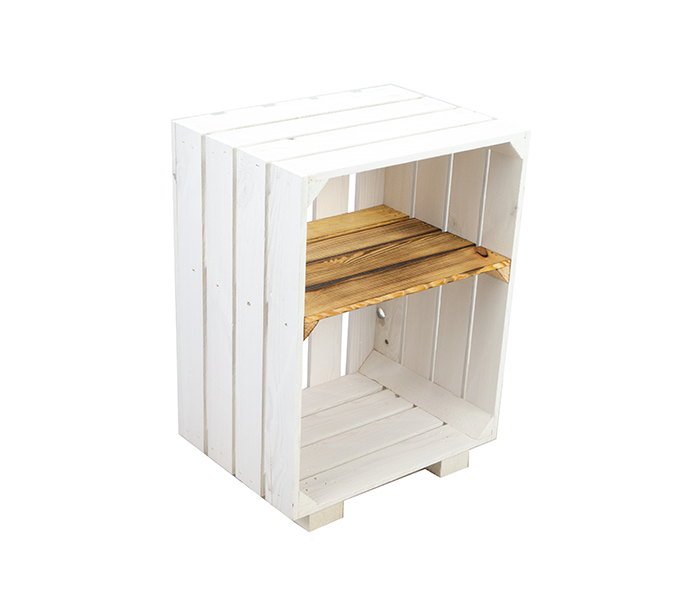 Nachttisch weiss mit geflammten Holzplanken mit Mittelbrett geflammt