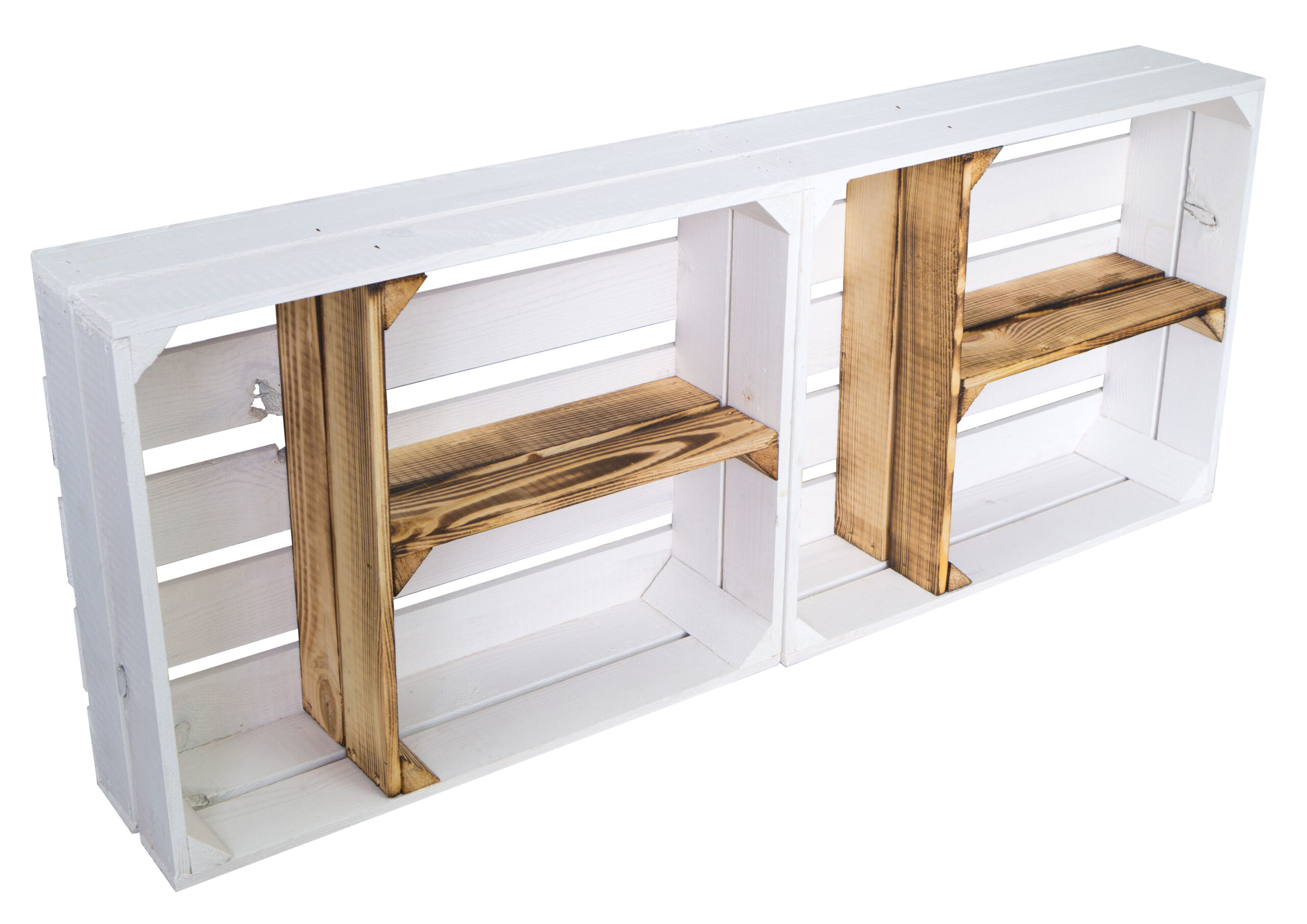 Diese flache Kiste wurde mit einer T Einlage versehen, sodass sich diese  wunderbar als Ablagekiste oder als Gewürzregal verwenden lässt. Schöne Kombination in weiss und geflammter Optik, hier wurde das Inlet der Kiste abgeflammt. Achtung, geflammtes Holz kann noch leicht durch den entstandenen Russ abfärben.
