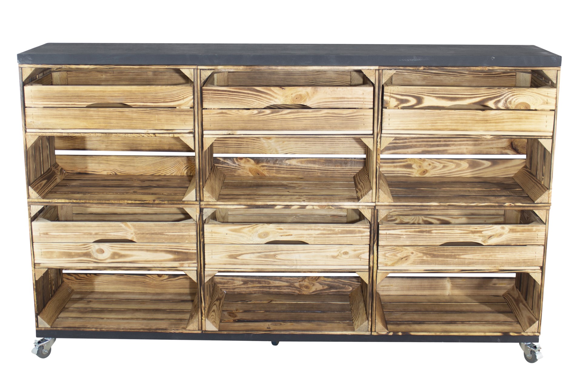 Raumtrenner/ Kommode aus geflammten Kisten mit 2 Bohlenbrettern in schwarz auf Rollen 150x93x30cm