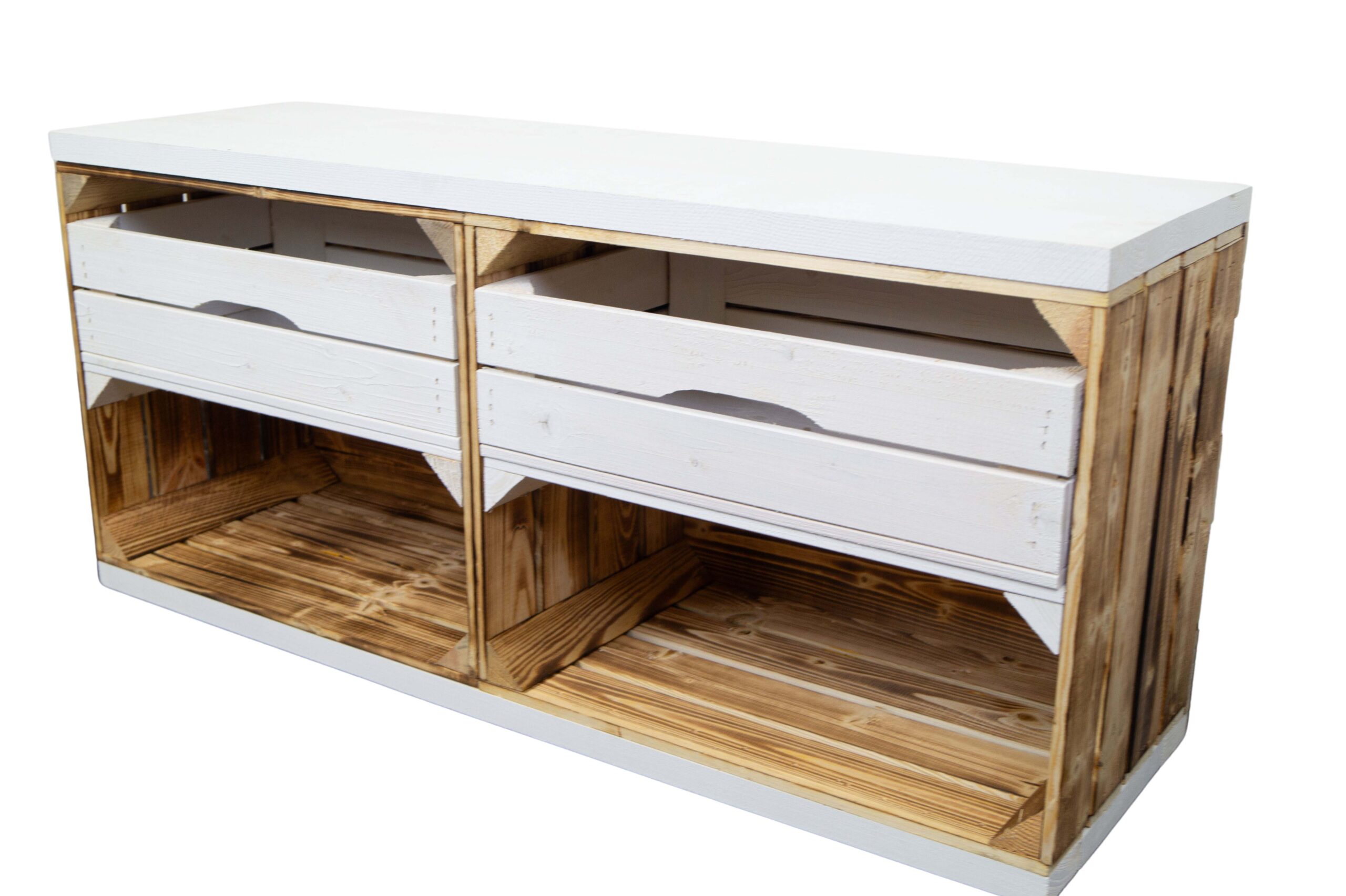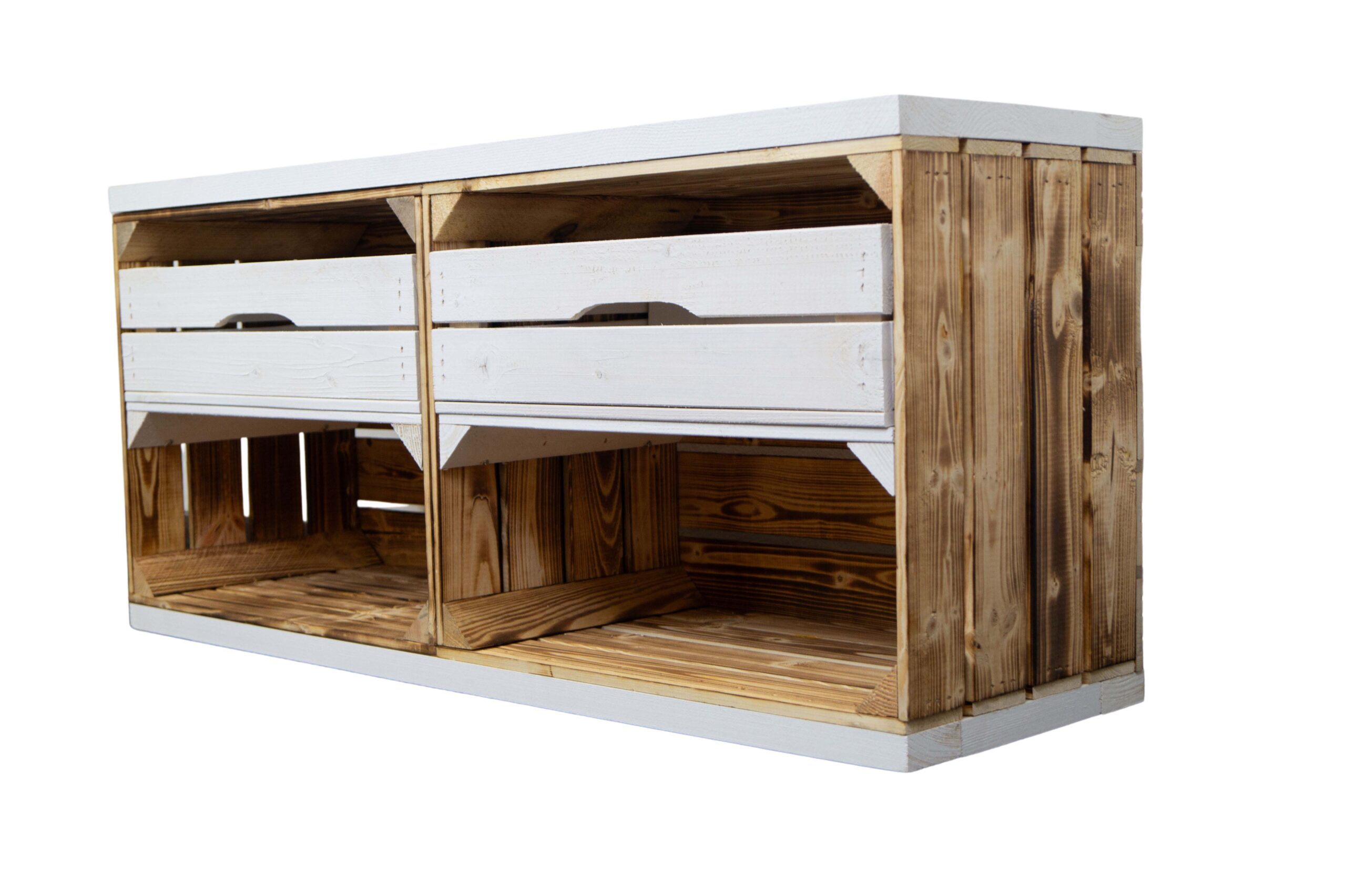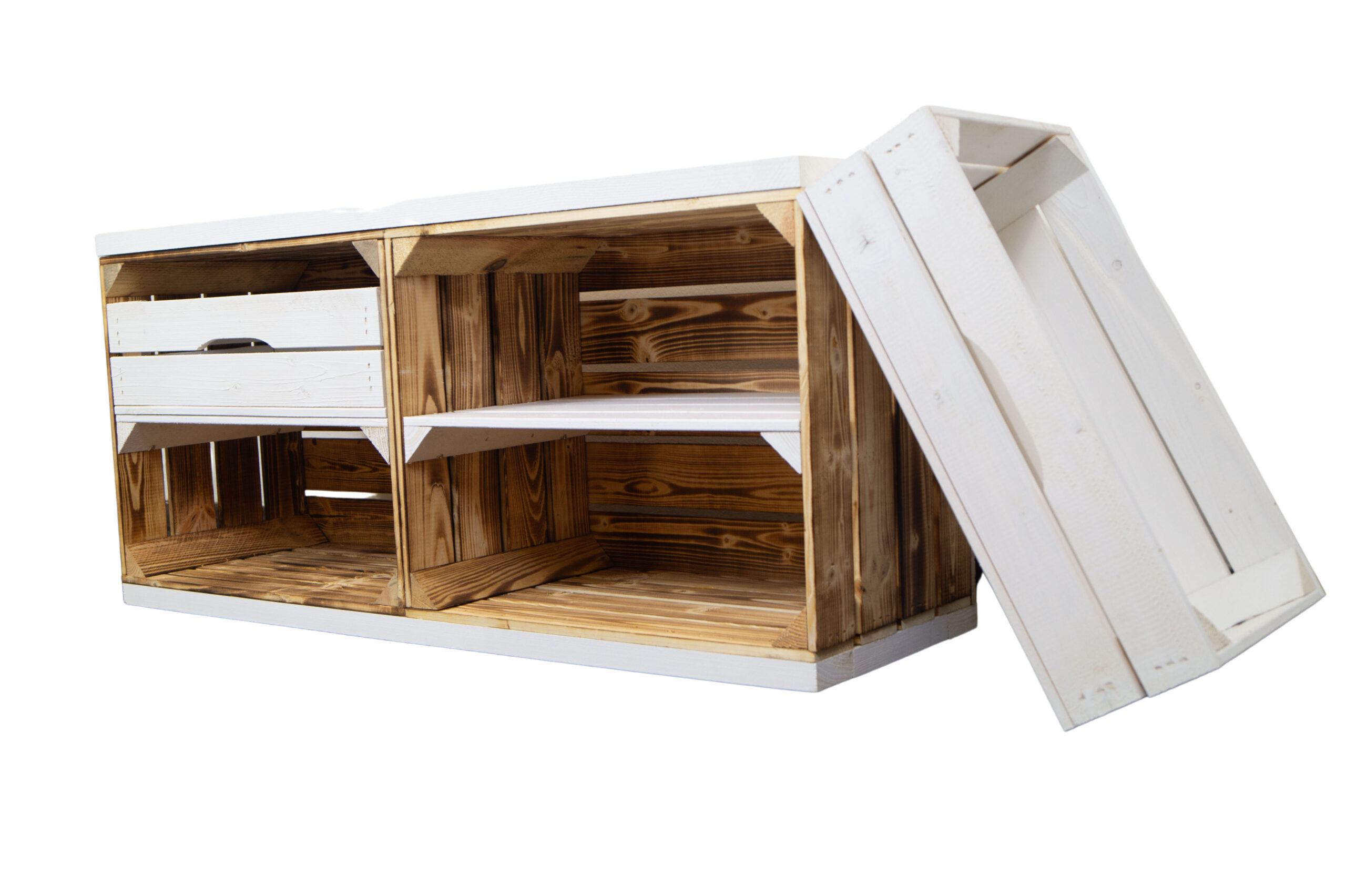 Regal aus zwei geflammten Kisten mit Mittelbrett und Bohlenbrett in weiß inkl. Schublade, auf Rollen