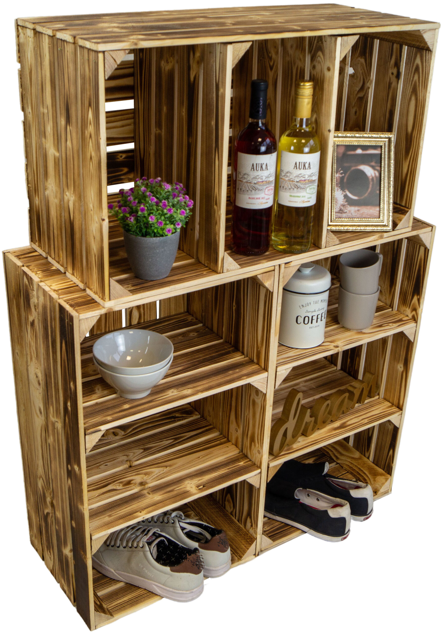Achtung: Geflammte Kisten: Durch das abflammen der Kiste entsteht Russ der natürlich vor Gebrauch entfernt werden sollte.