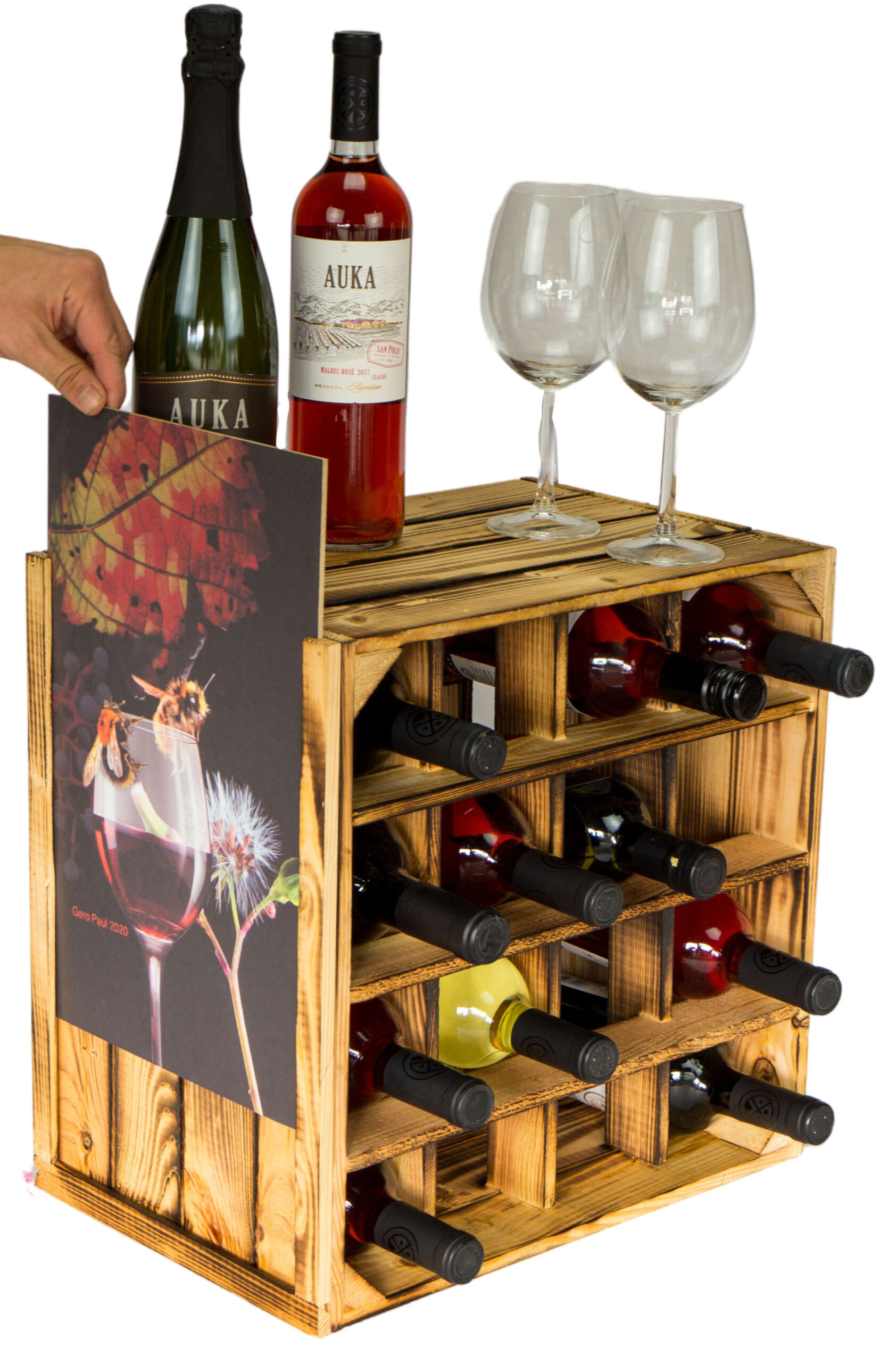 Dieses schöne, neue geflammte Weinregal hat für mehrere (16 Einlagefächer) Flaschen Platz. Bitte berücksichtigen Sie, dass die Kisten durch das Flambieren des Holzes leicht abfärben kann.