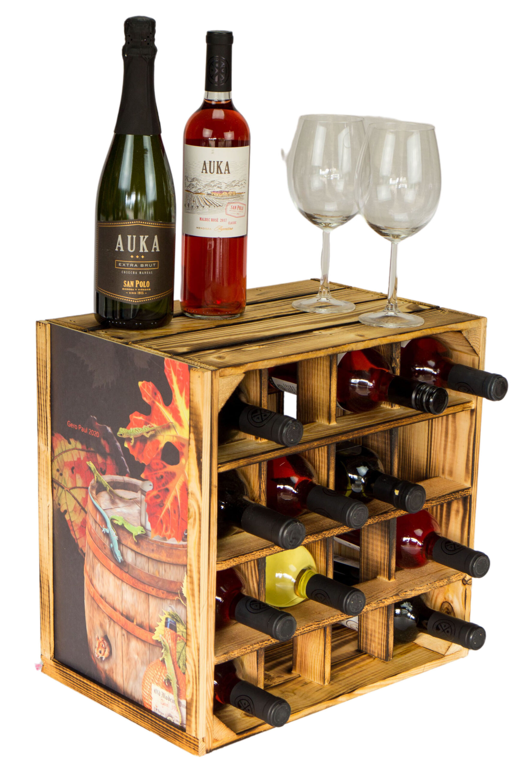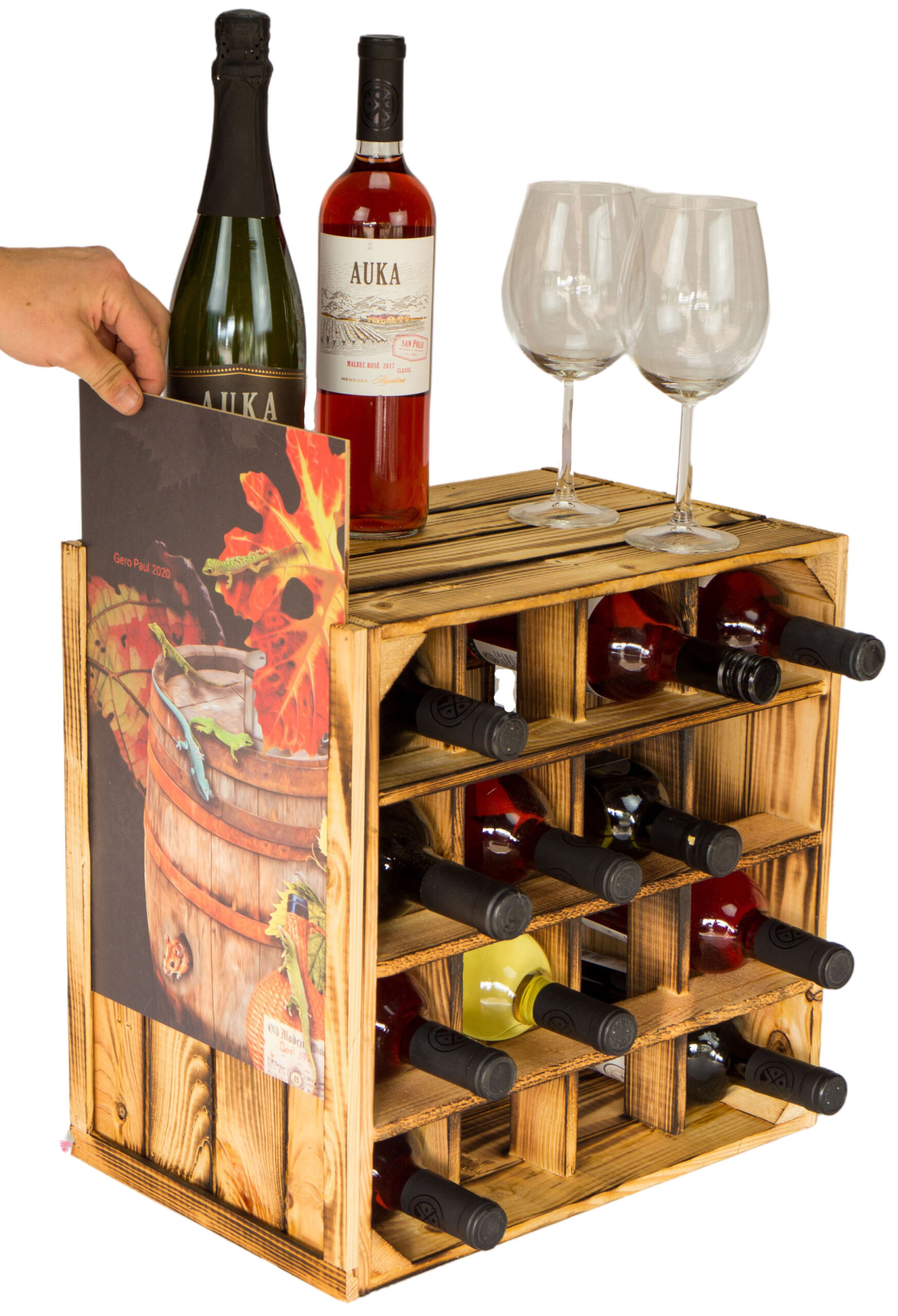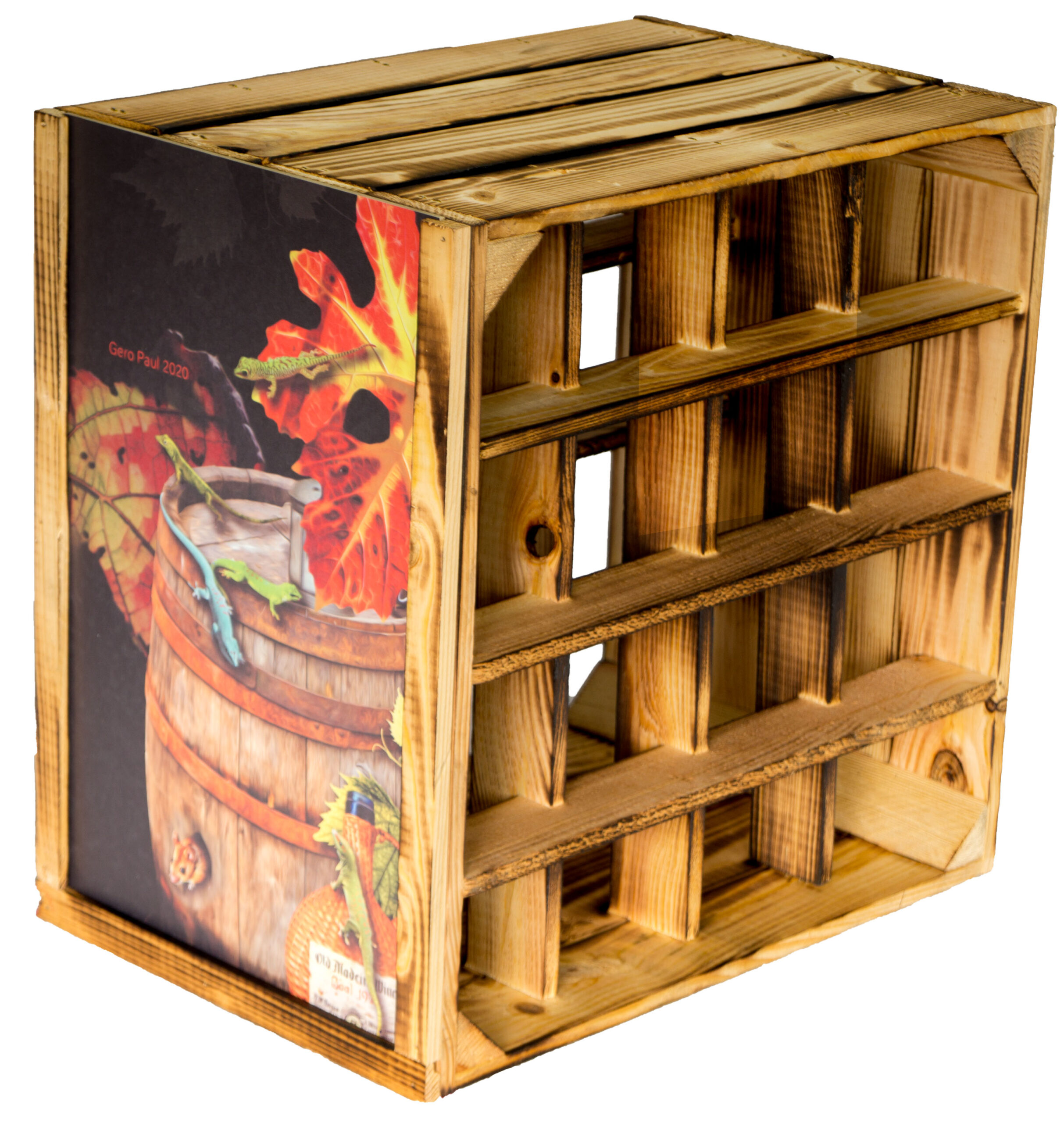 Dieses schöne, neue geflammte Weinregal hat für mehrere (16 Einlagefächer) Flaschen Platz. Bitte berücksichtigen Sie, dass die Kisten durch das Flambieren des Holzes leicht abfärben kann.